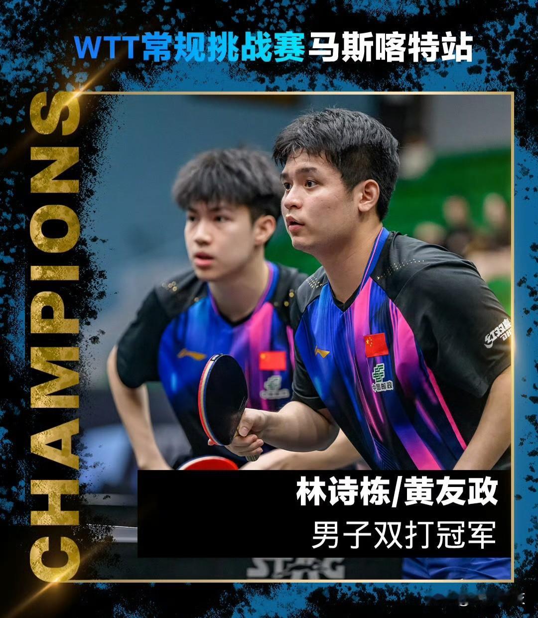【男双夺冠!林诗栋黄友政四局击败德国组合夺冠!】 WTT马斯喀特常规挑战赛男双决赛,林诗栋/黄友政3-1击败杜达/弗朗西斯卡夺冠,四局比分:11-6,11-6,11-13,11-5。 恭喜林诗栋/黄友政夺得冠军!混双亚军,男双冠军,前两项一冠一亚。
