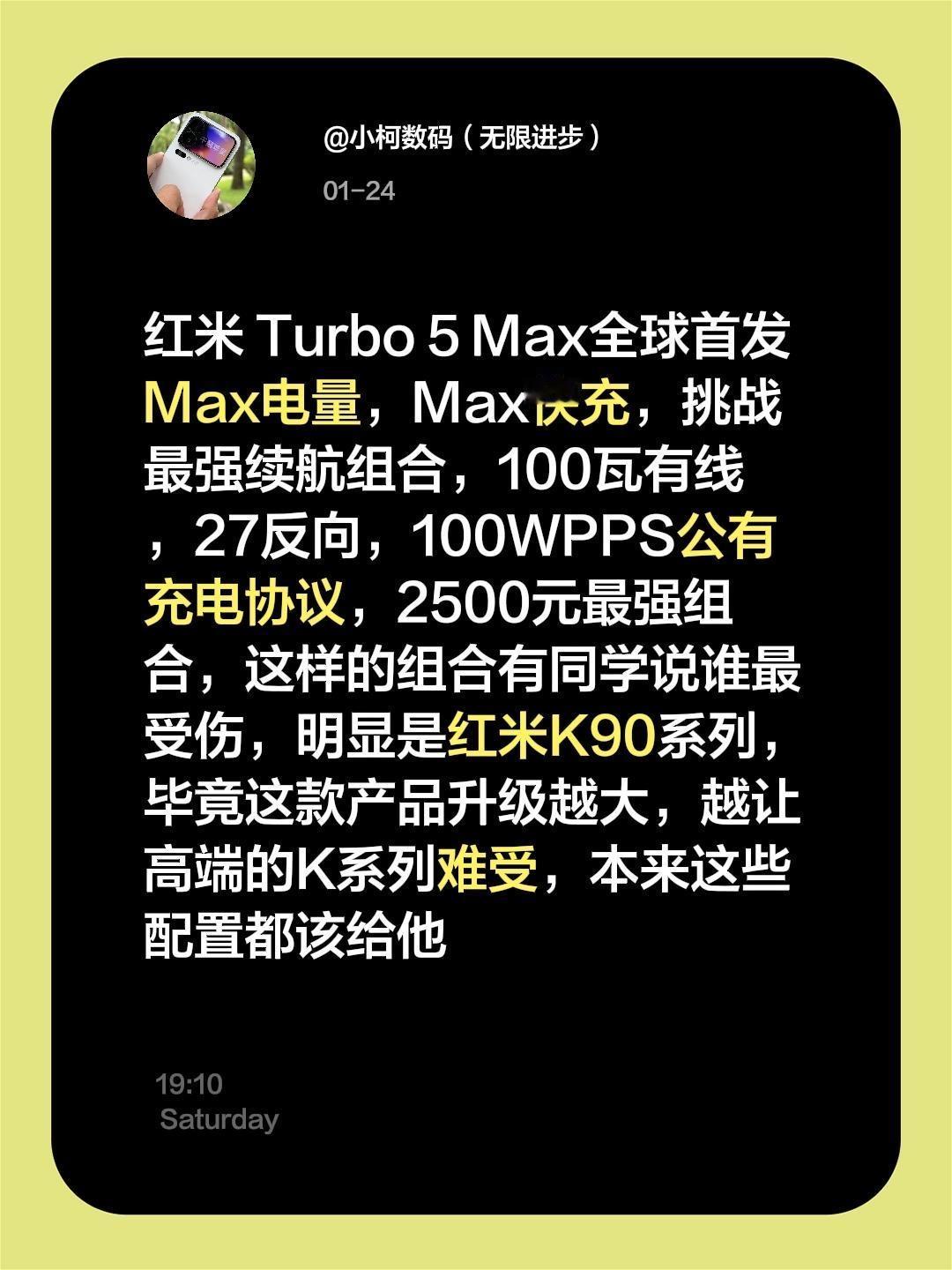 红米 Turbo 5 Max全球首发Max电量,Max快充,挑战最强续航组合,100瓦有线,27反向,100WPPS公有充电协议,2500元最强组合,这样的组合有同学说谁最受伤,明显是红米K90系列,毕竟这款产品升级越大,越让高端的K系列难受,本来这些配置都该给他