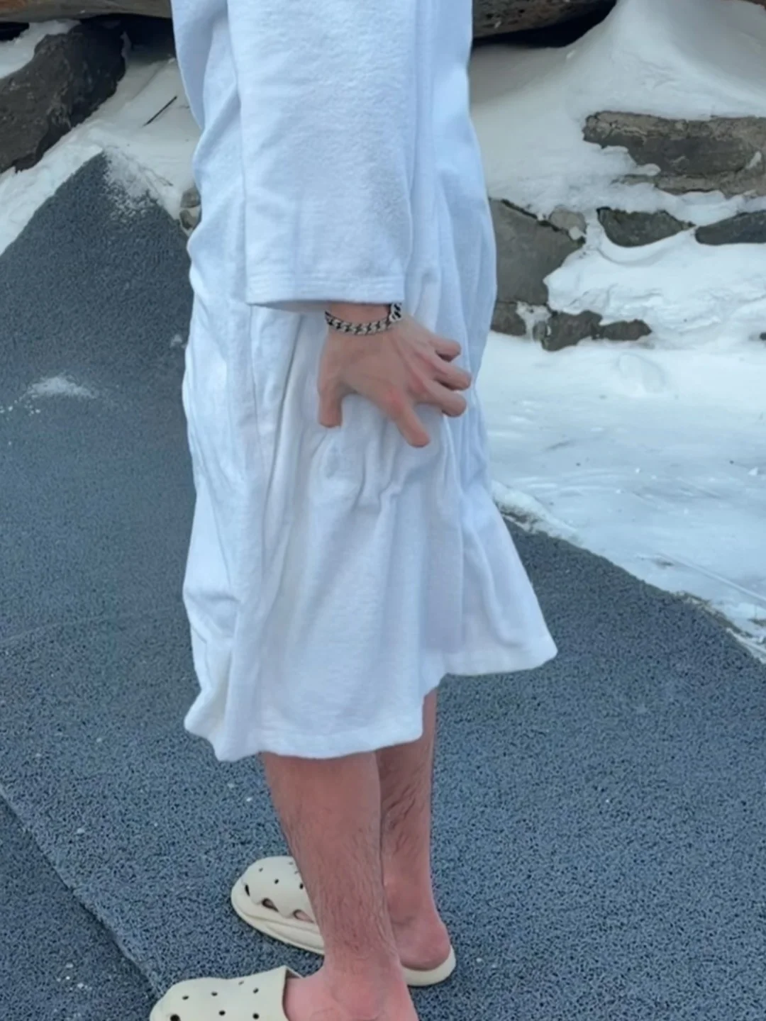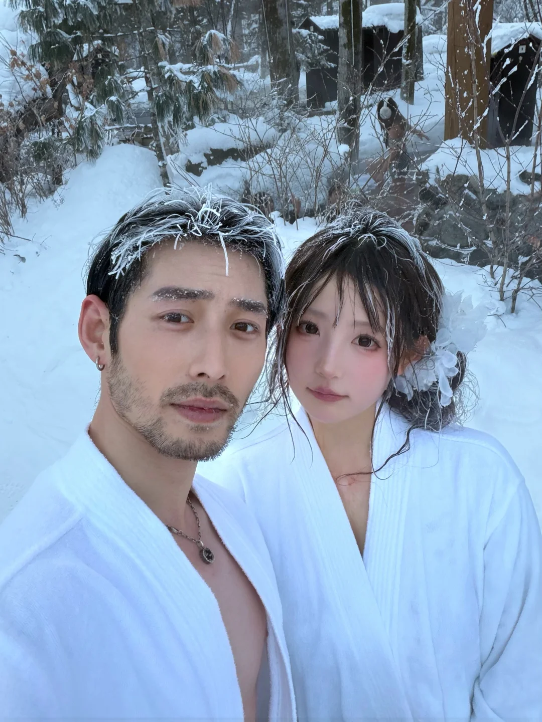 浴袍头发全都冻硬了 也算是一起白了头哈哈哈