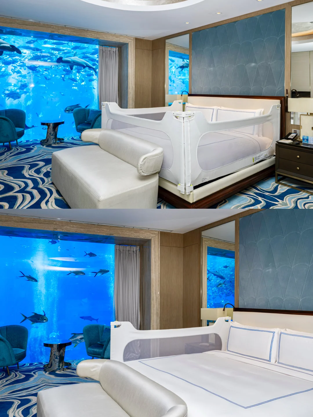 我们住的海底房,在房间就可以海底世界,与鱼共眠,透过落地窗看着各种鱼儿在你的面前游来游去,感觉自己置身于海洋世界之中!这次带娃出行,真是选对酒店了,我家小朋友睡觉总是滚来滚去,很容易摔下床,办理入住时,前台主动问要不要婴儿床、床围或者一次性儿童内裤,说会直接送到房间。我给孩子选了床护栏,拿到手发现是Babycare的——就是我们家里用的同款!升降丝滑,贴紧床垫一点缝隙都没有,娃晚上翻身打滚都不怕,我终于能睡个安稳觉了。