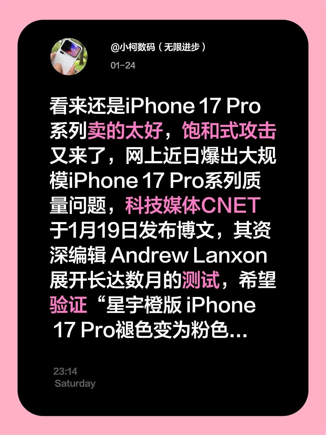 看来还是iPhone 17 Pro系列卖的太好,饱和式攻击又来了,网上近日爆出大规模iPhone 17 Pro系列质量问题,科技媒体CNET 于1月19日发布博文,其资深编辑 Andrew Lanxon展开长达数月的测试,希望验证“星宇橙版 iPhone 17 Pro褪色变为粉色”的社区用户反馈