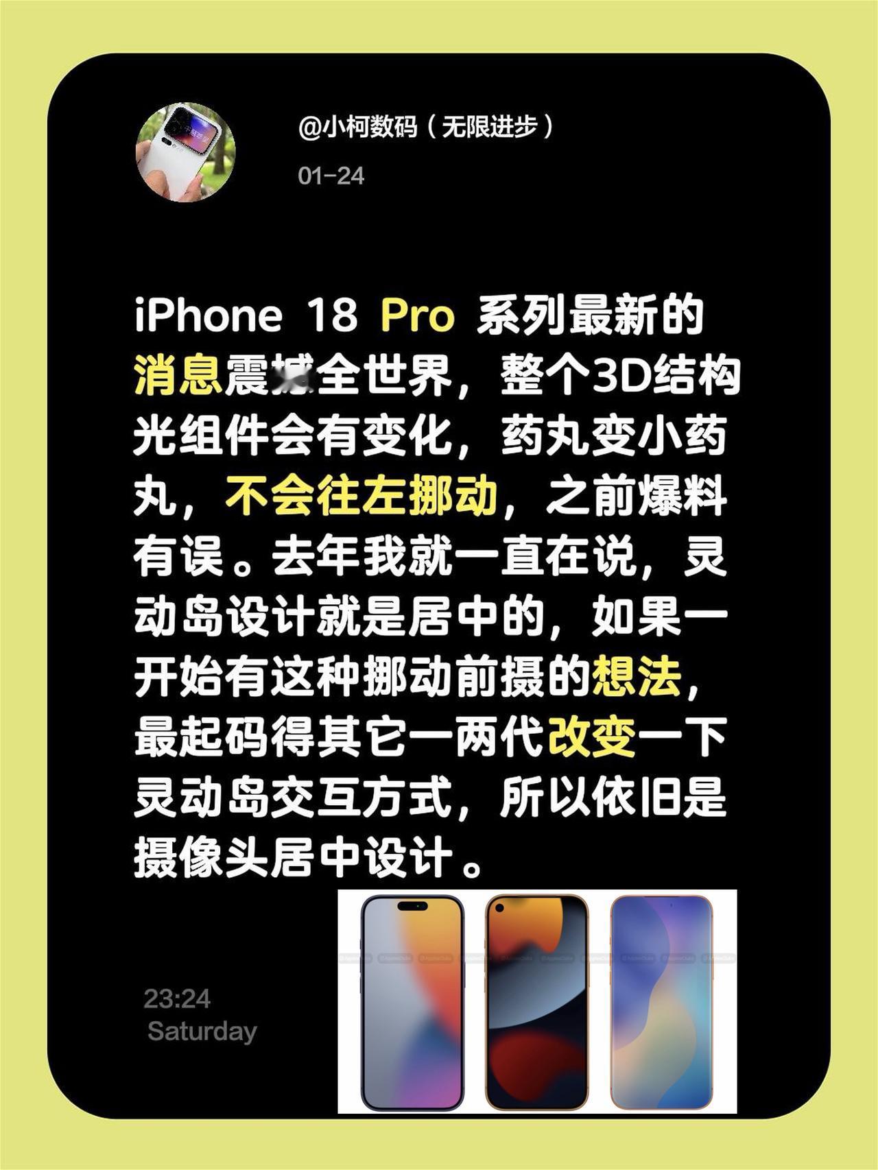 iPhone 18 Pro 系列最新的消息震撼全世界,整个3D结构光组件会有变化,药丸变小药丸,不会往左挪动,之前爆料有误。去年我就一直在说,灵动岛设计就是居中的,如果一开始有这种挪动前摄的想法,最起码得其它一两代改变一下灵动岛交互方式,所以依旧是摄像头居中设计。