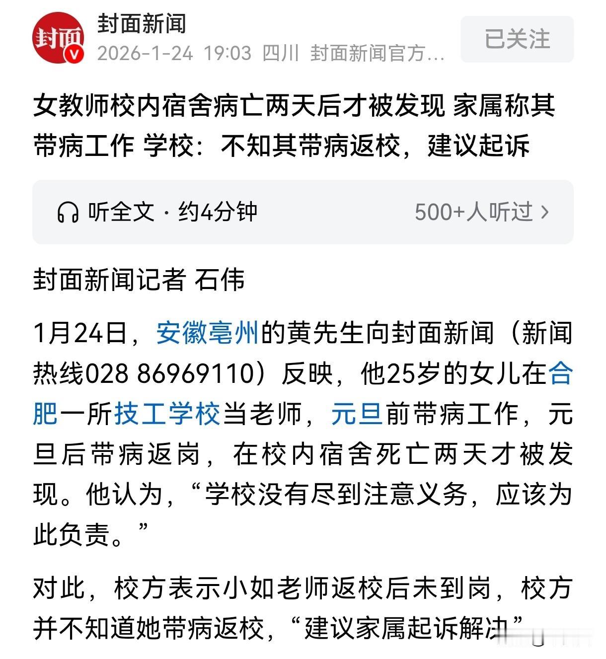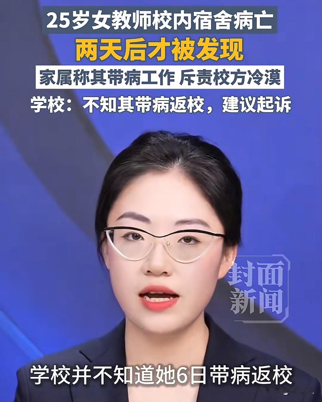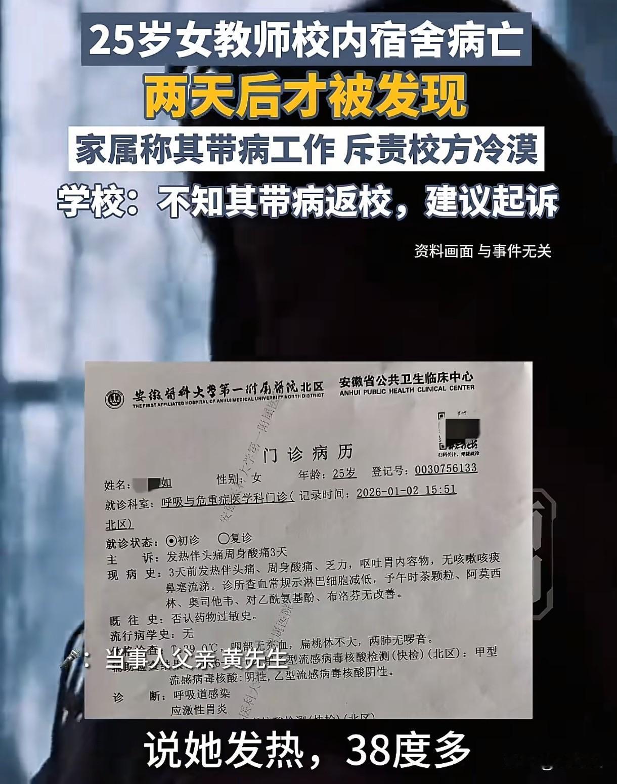 “太可惜了!”安徽亳州,25岁女子患病,本想请假,可接到学校通知,要参加迎检工作,女子带病返岗,在校内宿舍死亡2天后才被发现。女子父亲认为女儿2天没有去上班,学校也没发现,学校没有尽到注意义务,应该为此事负责。可学校却称:不知道她带病返校,建议家属起诉解决。 黄先生怎么也没想到,自己乖巧懂事的女儿竟然会以这种方式离开自己。 2024年,小如从学校毕业后,凭借自身努力,成功应聘到母校任职,并担任了班主任一职。 他们原本以为这是女儿美好未来的开始,一家人还满心欢喜地憧憬着女儿的美好前程。 2026年元旦前夕,学校要求组织元旦晚会,小如便在晚自习和课余时间,带着学生紧张排练。 那段时间,她就像一个不知疲倦的陀螺,全身心投入其中,尽管自己感冒发烧,身体难受的厉害,可她还是不敢耽误节目排练,硬是咬牙坚持。 12月30日,节目演出后,小如也松了一口气,想着自己总算能放松下来了。 12月31日,学校即将放假,小如实在撑不住了,跟学校请假,可副校长却说当天下午还要开会,让她在坚持一下。 开完会后,小如实在没有力气自己回家,便喊了在合肥打工的弟弟来接她,在弟弟住处休息了几天。 这几天,她去了诊所和医院治疗。2026年1月2日,她到医院就诊,被诊断为呼吸道感染、应激性胃炎。 1月4日学校要上课,小如并未完全康复,她跟学校请假到1月6日,可1月6日学校通知有迎检工作,尽管身体不适,小如还是拖着病体回到了学校。 她在学校住的是单人间,对门住着其他老师,1月7日有同事见她生病,主动给她送了饭菜,当天下午,有学生来帮小如打扫卫生。 之后的几天,小如并未出门,1月10日晚上8点多,有学生去宿舍找她,却发现她已经没了呼吸。 法医鉴定,小如系呼吸心跳停止死亡,死亡时间在48小时左右,大概是1月8日晚上去世的。 这个消息如同晴天霹雳,让黄先生瞬间崩溃,女儿才25岁,人生才刚刚开始,就这样匆匆离开了人世,叫他这个做父亲的如何能接受。 黄先生悲痛欲绝的同时,心中也充满了愤怒。 他觉得1月7日、8 日是学校工作时间,女儿又住在学校宿舍,两天没去上班,学校也太冷漠了,但凡稍微重视一点,早点发现女儿的异常,及时将她送医,也许就能避免这场悲剧的发生。 可学校的回应却让黄先生更加心寒,学校称小如1月6日返校后并未到岗工作,也没参加迎检工作,校方根本不知道她已经返校,是事后查监控才知道她当天回来的,并且小如假期去了弟弟住处休息,其家人也知道她生病的事情的。 学校还表示,小如是疾病死亡,与学校无任何直接或间接关系,如果家属认为学校有责任,建议起诉。 黄先生的心情和悲痛能让人理解,她的女儿年仅25岁,作为班主任,小如带病坚持工作,甚至在身体极度不适的情况下仍响应学校要求返校,最终因呼吸心跳停止死亡。 小如作为教师,虽非学生,但学校对其仍负有一定的管理职责,尤其是在工作期间和住宿期间。 若小如因自身疾病等与工作无关联的原因正常死亡,且学校已履行合理管理职责,如及时通知家属、配合调查等,则学校可能无需承担责任。 如教师本身患有严重疾病,在宿舍自然死亡,学校在不知情且无管理疏忽的情况下,通常不构成责任要件。 但是小如1月6日返校后,连续多天未去上班,学校也没有通过主动联系,或者询问其他教师等方式确认其状况,可能存在疏忽。 小如的情况是否构成工伤呢? 若教师在工作时间和工作岗位突发疾病死亡,或在48小时之内经抢救无效死亡,可被鉴定为工伤。 如教师在宿舍休息时突发疾病,但该疾病与工作劳累等因素相关,且在48小时内死亡,符合工伤认定条件。 若教师因自身严重疾病在宿舍自然死亡,且与工作无直接关联,则不符合工伤认定条件。 小如的遭遇让人同情又惋惜,身体是自己的,生病了,该请假就请假,不要带病工作,好好爱惜自己的身体。 学校也应该多些人情味,多关心教职工的身体,也希望学校后续能够和家属妥善处理此事。