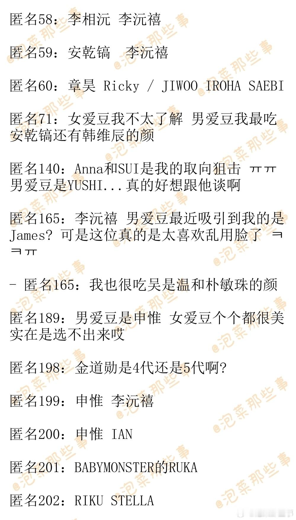 🔥韩网热帖评论翻译🔥5代最符合你审美取向的男女爱豆分别是谁啊?韩网原帖帖主发问:5代最符合你审美取向的男女爱豆分别是谁啊? 帖主先来:BOYNEXTDOOR的TAESAN BABYMONSTER的ASAcr.instiz
