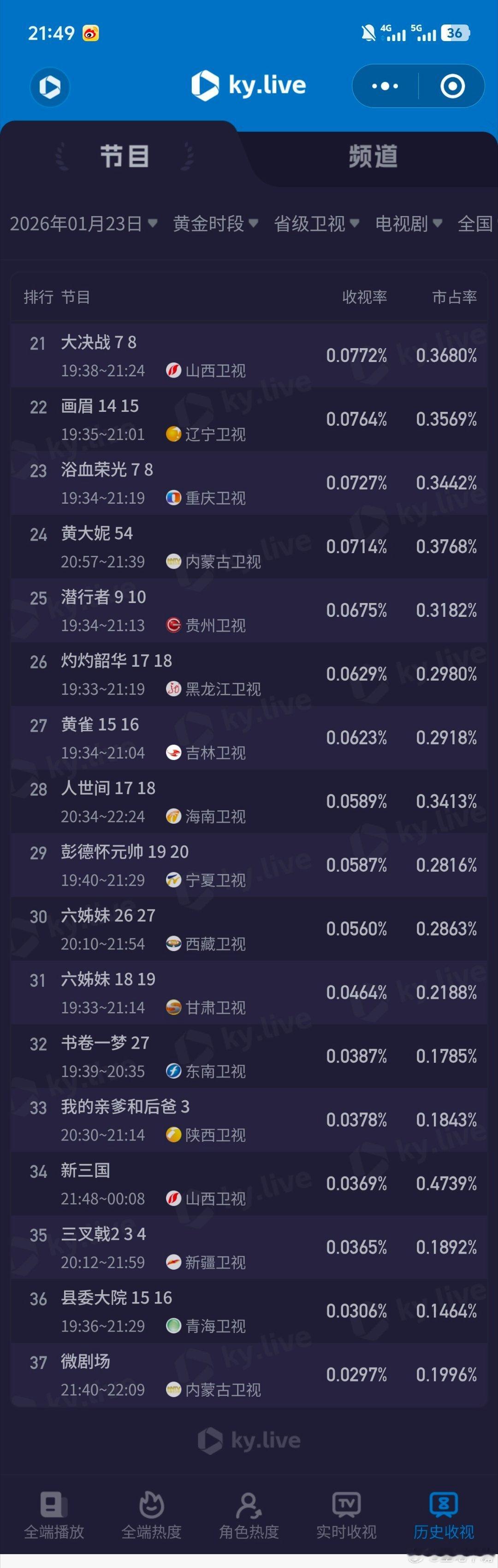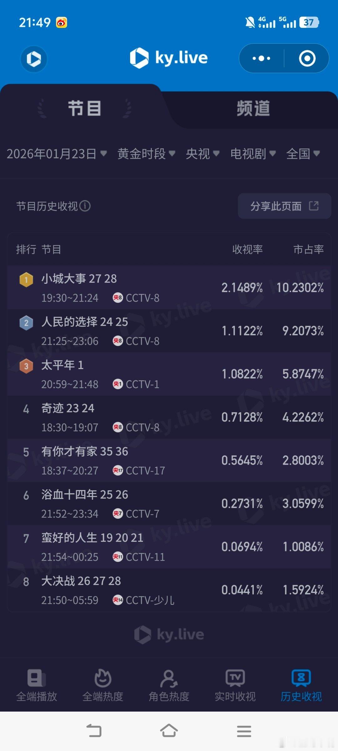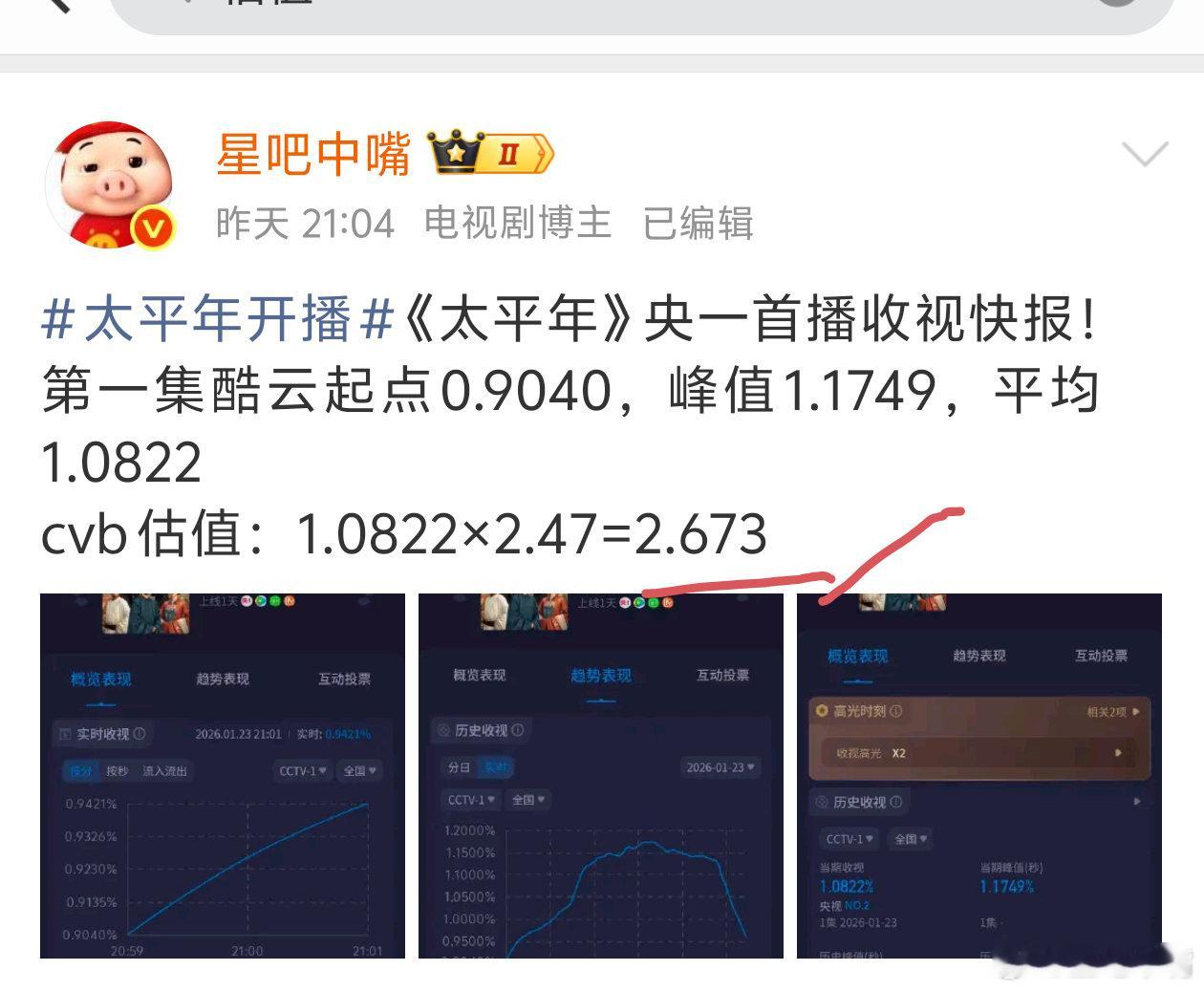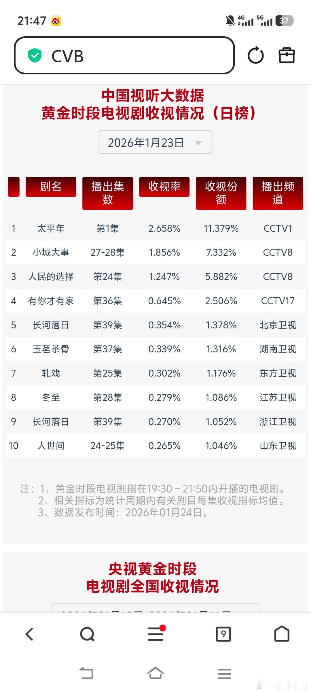 太平年 五代十国1月23日cvb收视日报!《太平年》首播收视2.658!全网预测最准!太平年 2.658,酷云1.0822,系数2.456小城大事1.856,酷云2.1489,系数0.864昨晚估值这两部都差不多