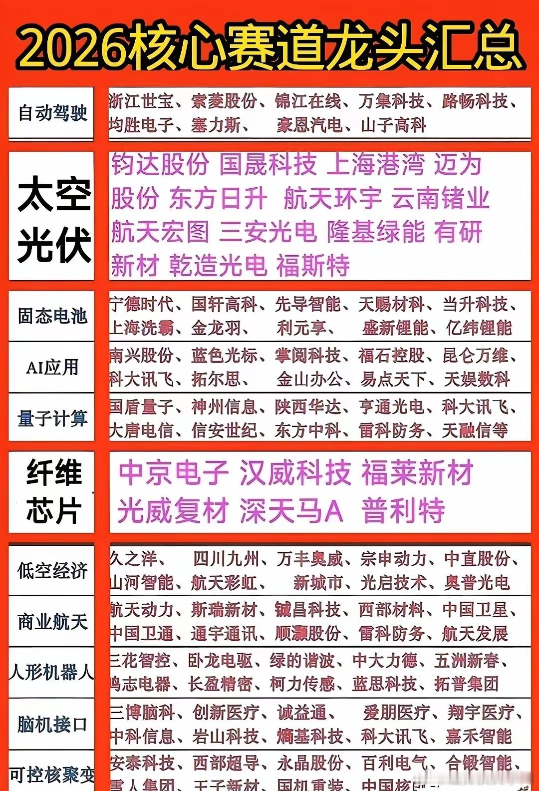 2026十大核心热点赛道龙头梳理,这些赛道将反复活跃:太空光伏、纤维芯片、量子科技、可控核聚变、人形机器人、商业航天、脑机接口、低空经济、固态电池、自动驾驶。