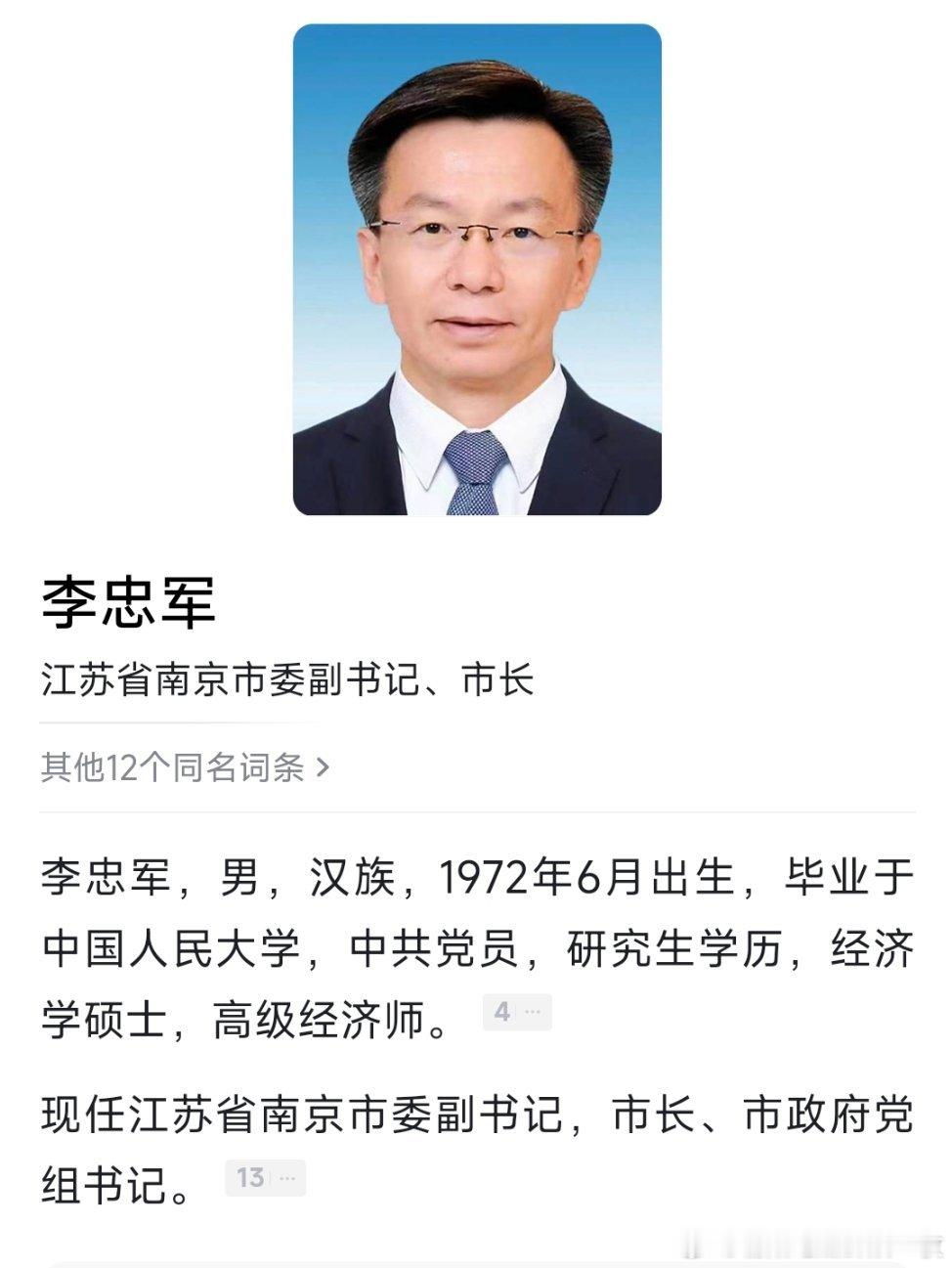 李忠军当选南京市市长。
