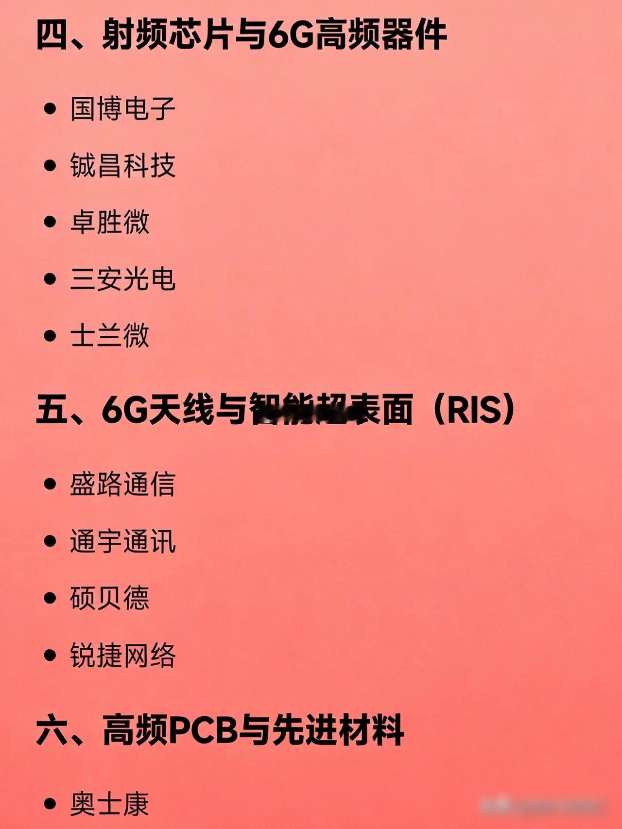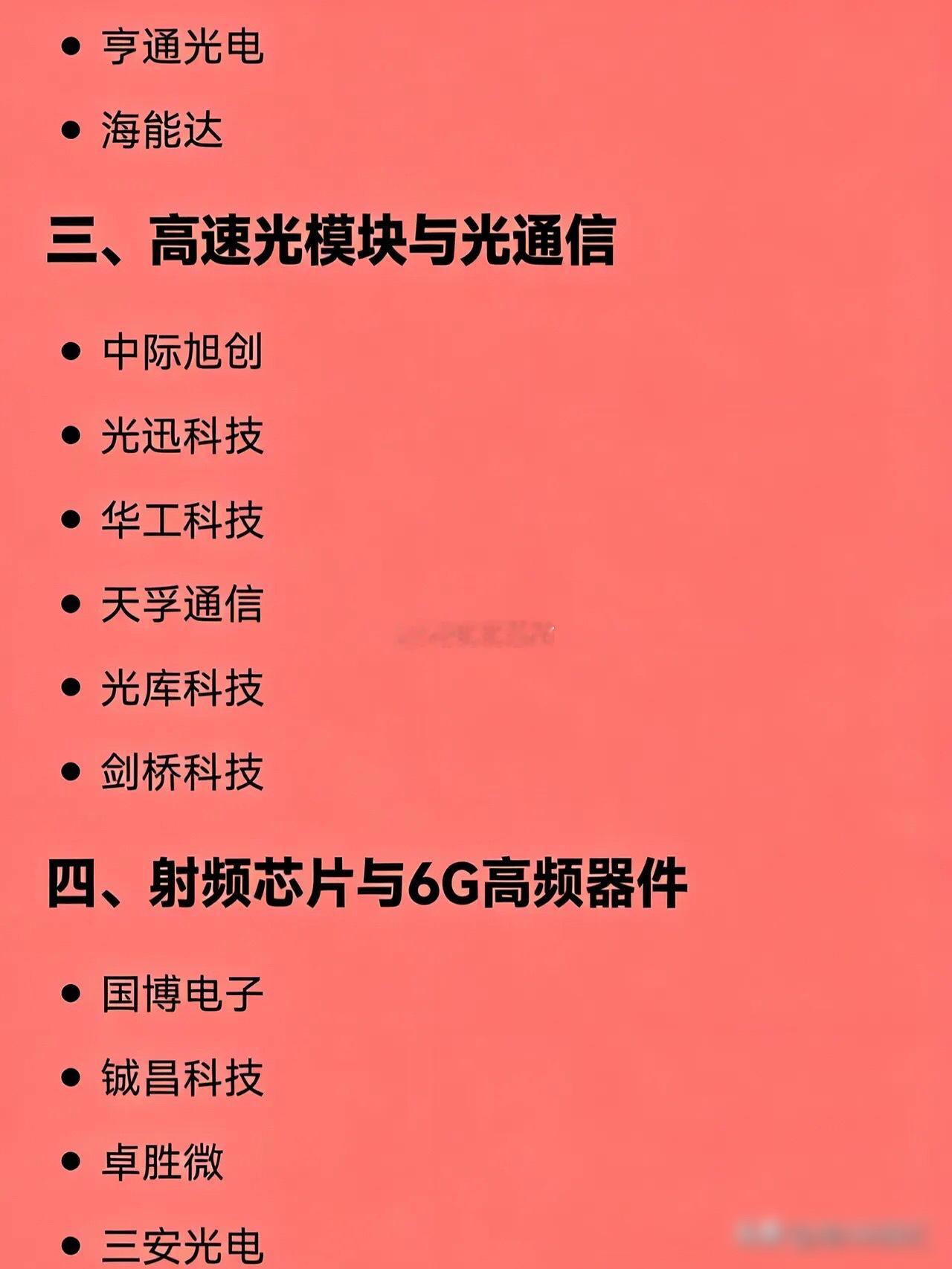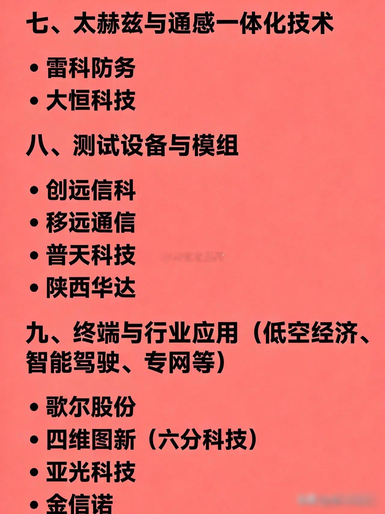 最新的6G概念相关企业全汇总一、核心设备与标准制定中兴通讯信科移动中国移动紫光股份(新华三)二、卫星通信 / 星地融合中国卫通中国卫星海格通信航天宏图亨通光电海能达三、高速光模块与光通信中际旭创光迅科技华工科技天孚通信光库科技剑桥科技四、射频芯片与6G高频器件国博电子铖昌科技卓胜微三安光电士兰微五、6G天线与智能超表面(RIS)盛路通信通宇通讯硕贝德锐捷网络六、高频PCB与先进材料奥士康兴森科技本川智能华正新材七、太赫兹与通感一体化技术雷科防务大恒科技八、测试设备与模组创远信科移远通信普天科技陕西华达九、终端与行业应用(低空经济、智能驾驶、专网等)歌尔股份四维图新(六分科技)亚光科技金信诺信维通信十、其他配套或高弹性标的力合科创意华股份烽火通信震有科技臻镭科技赛微电子东田微瑞斯康达