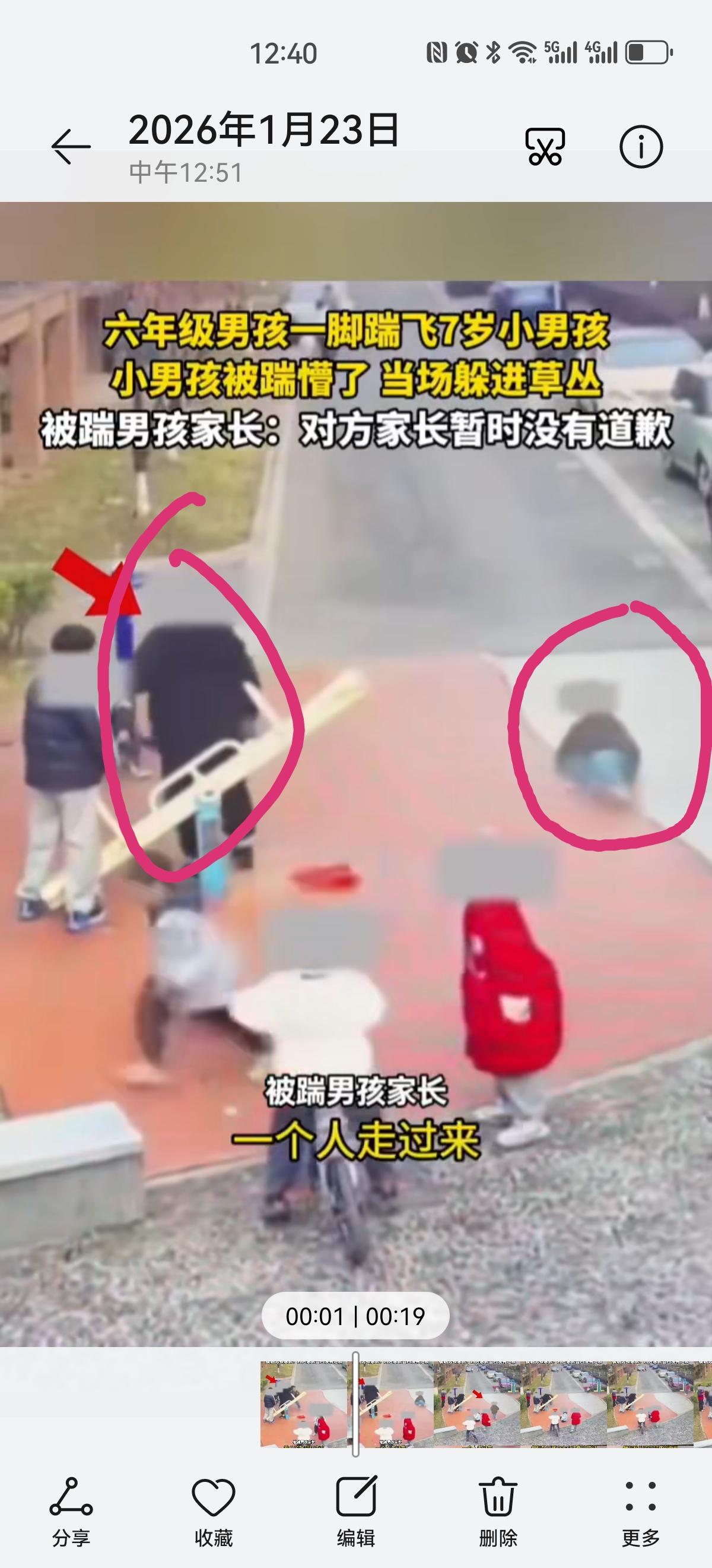 一个六年级的孩子, 居然当着这么多人的面, 一脚把7岁的小男孩踹飞出去, 孩子当场就懵了, 吓得躲进了草丛里。 更气人的是, 施暴者的家长到现在都没道歉! 我就想问一句: 这是孩子没教养, 还是家长没担当? 一个六年级的孩子, 怎么会养成这种一言不合就动手, 下手还这么狠的习惯? 说白了,就是家长平时的纵容! 如果你是这个7岁男孩的家长, 你会怎么做? 是直接找到对方家里, 要求赔礼道歉+赔偿, 还是选择息事宁人: 怕孩子再被报复, 选择私下和解,自认倒霉? 按我的态度, 息事宁人绝对不可能! 因为你今天退一步, 孩子以后在学校、 在社会上就会退一百步! 一定让孩子知道, 被欺负了不用怕, 爸妈会用合法的方式 帮你讨回公道。