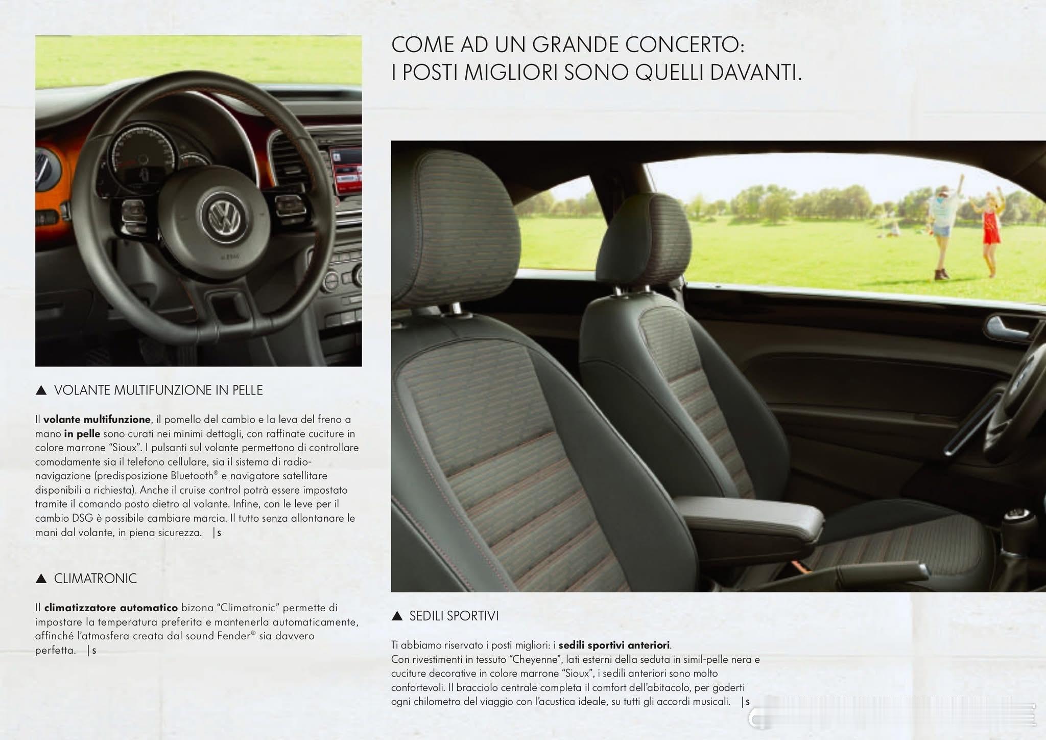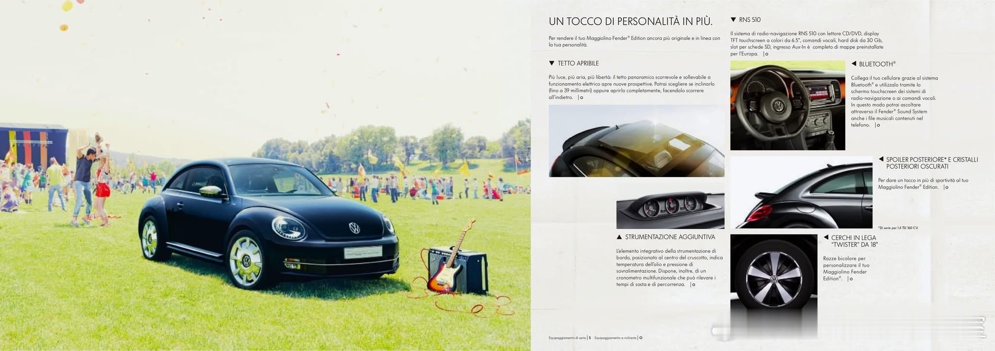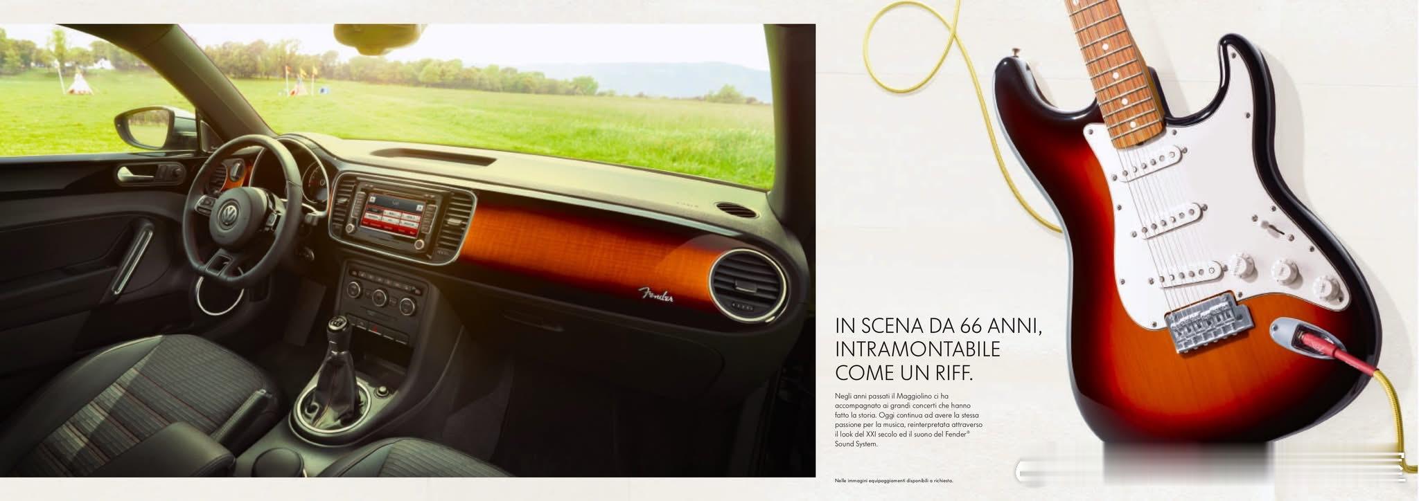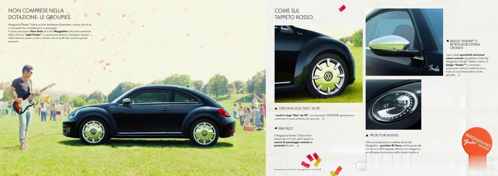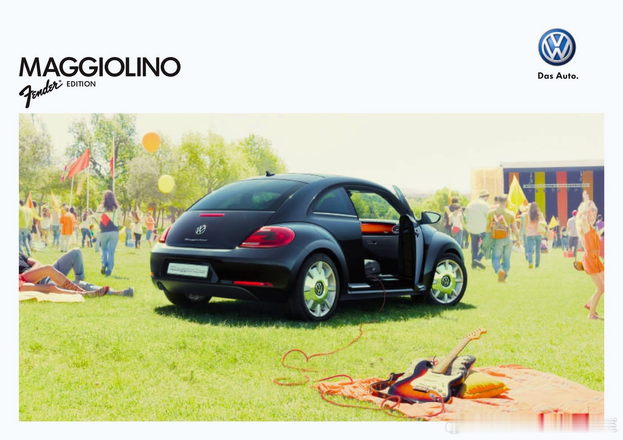 这是大众甲壳虫(意大利市场命名为Maggiolino)的Fender Edition特别版(第三代A5/5C甲壳虫,2012年在莱比锡车展首发),是大众与著名乐器/音响品牌Fender联名的车型。18英寸镀铬Disc轮毂、镀铬后视镜、车身侧柱Fender徽标;标志性的Sunburst木纹饰板(致敬Fender Stratocaster吉他),专属运动座椅,400W Fender 9扬声器高级音响;2012-2013年为主推广期,随后作为高配选装包在部分市场延续至甲壳虫停产(2019年)。