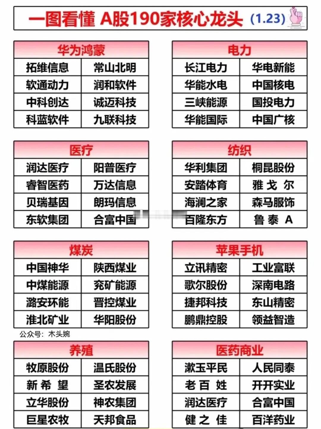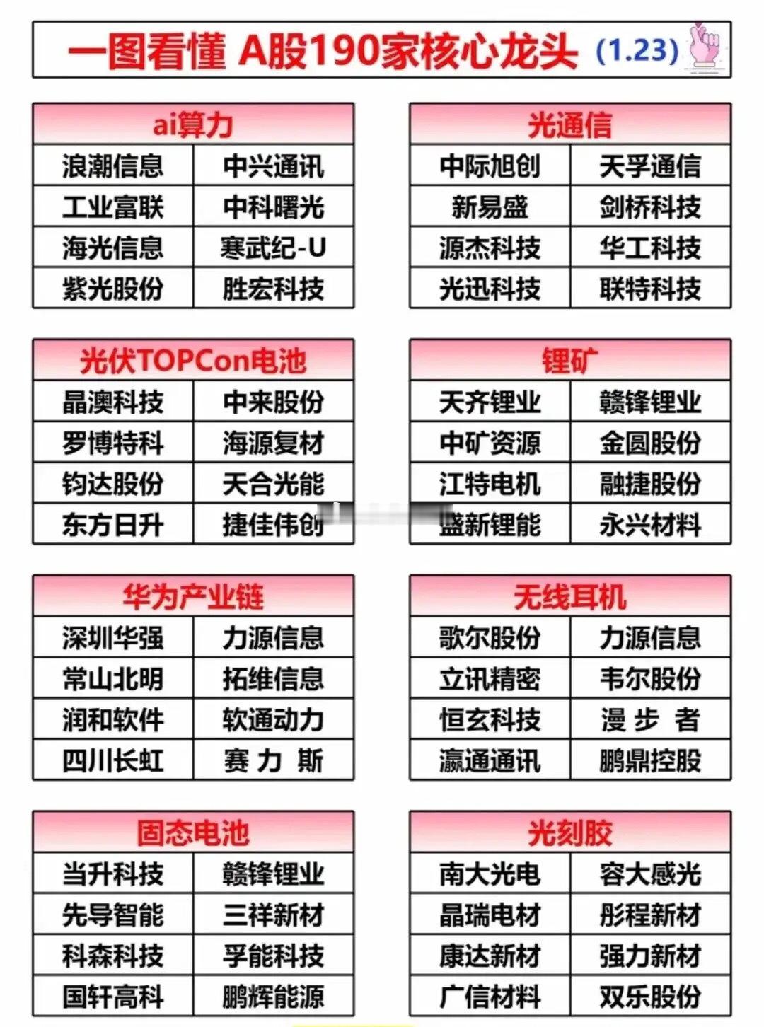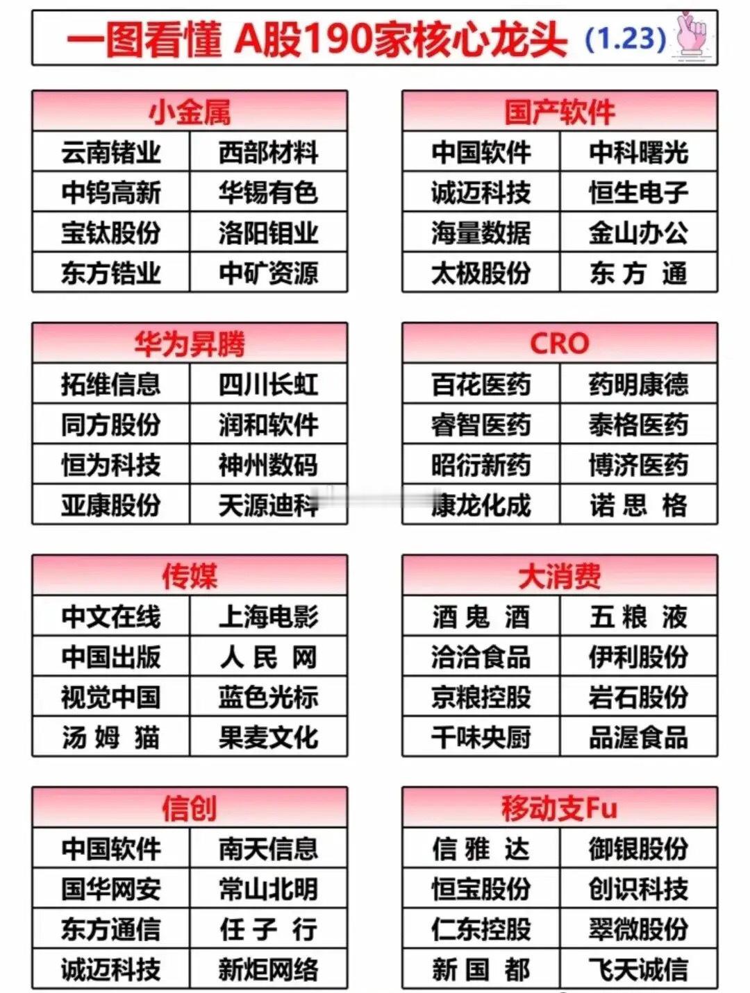 拒绝杂毛,全部是核心龙头!24个行业每个板块精选八大核心龙头,快来看看有没有你的持仓?从华为鸿蒙、AI算力到光伏、锂矿,从医疗医药到消费传媒,覆盖当下热门主线,各细分领域的龙头公司一目了然。不管是做行业研究,还是寻找投资参考,这份清单都能帮你快速锁定核心标的。AI算力核心代表:中科曙光(央企)光通信核心代表:光迅科技(央企)AI电网核心代表:中国西电(央企)AI信创核心代表:中国软件(央企)AI传媒核心代表:人民网(央企)……⚠️ 注:内容仅作科普,不构成投资建议,理财有风险,入市需谨慎。
