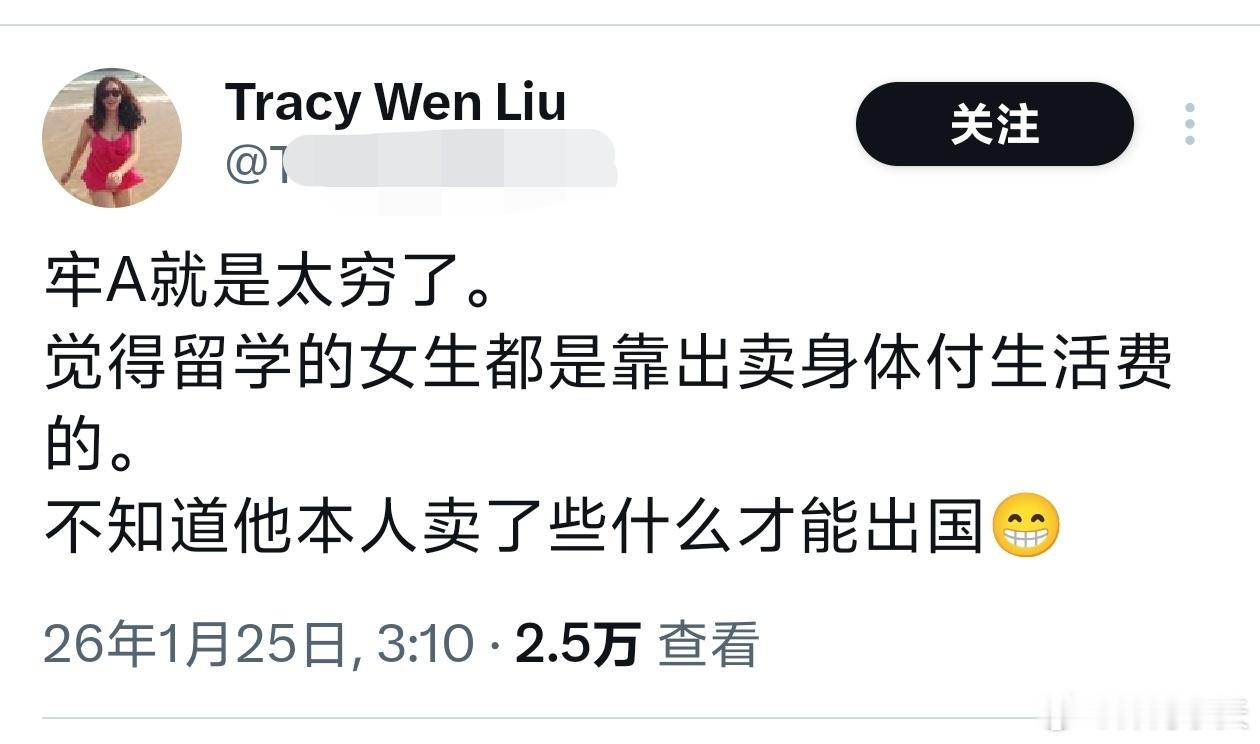 又没说谁,境外润人着急上火跳出来认了呢?另外,牢A也没说留学女生出卖身体换生活费啊,他举的例子都是白男或者黑蜀黍“出卖身体”赚中国留学生与家属的钱。这着急上火的号,怎么就把自己的事抖出来了呢?牢A最新直播牢A的含金量还在提高