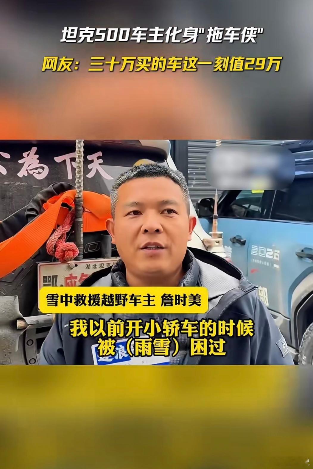 大雪天很冷拖车侠很暖自己被困过所以为他人解困,这根绳子,比几百万的豪车都贵啊