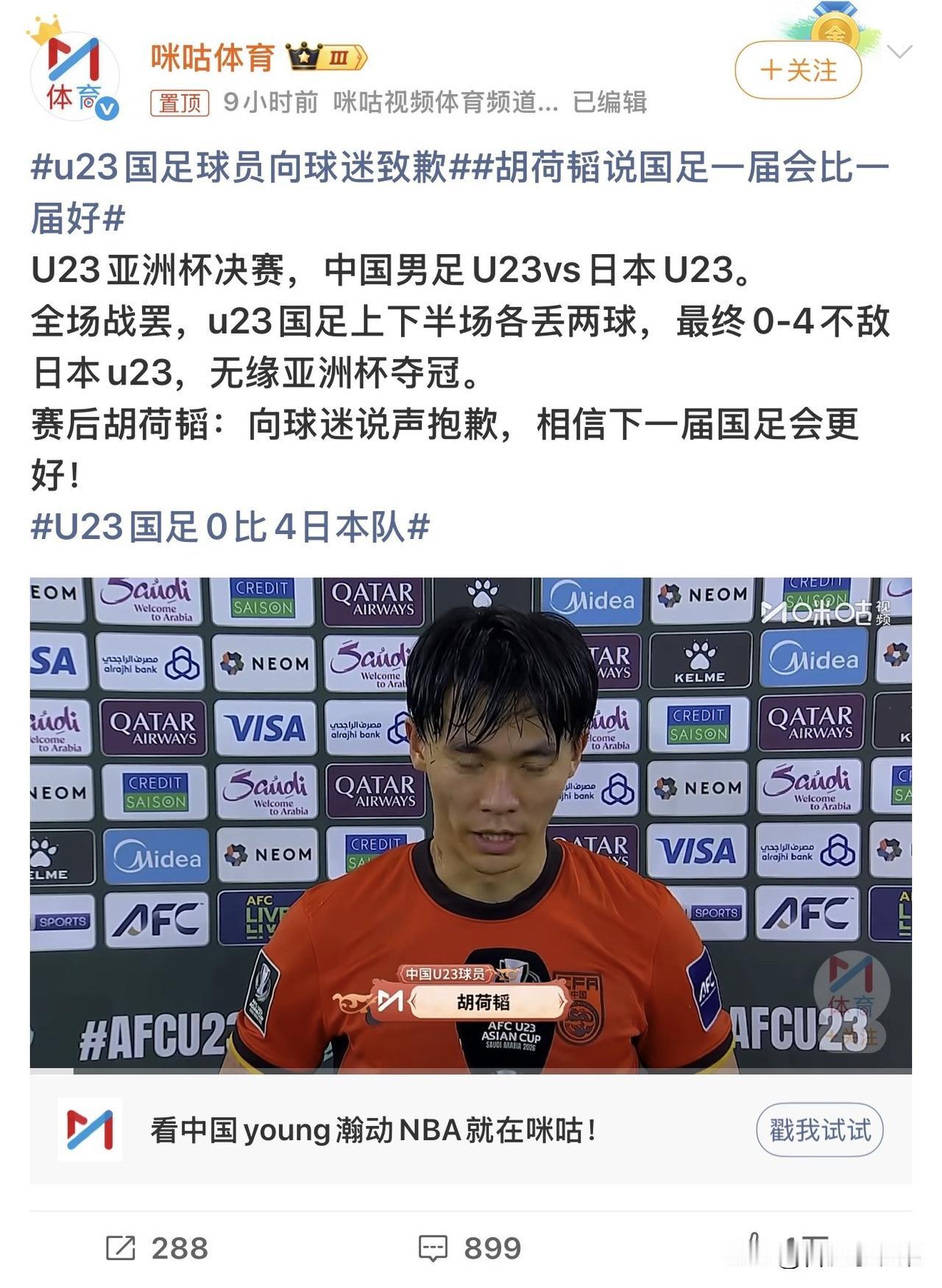 真的不必说抱歉!作为本次赛事第四档球队(公认垫底的4支队伍),能一路过关斩将杀进决赛,拿到队史最佳亚军,这本身就是奇迹,是给中国足球的惊喜! 胡荷韬说“一届会比一届好”,这不是空话,是这群年轻人用汗水拼出来的底气。比起赛后的道歉,更想看他们在场上继续拼、继续冲,把遗憾变成下一次的动力! 中国足球的进步,从来不是一蹴而就,而是靠一代又一代年轻人的坚持。为U23国足点赞,未来可期!💪⚽️爆料
