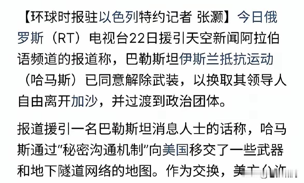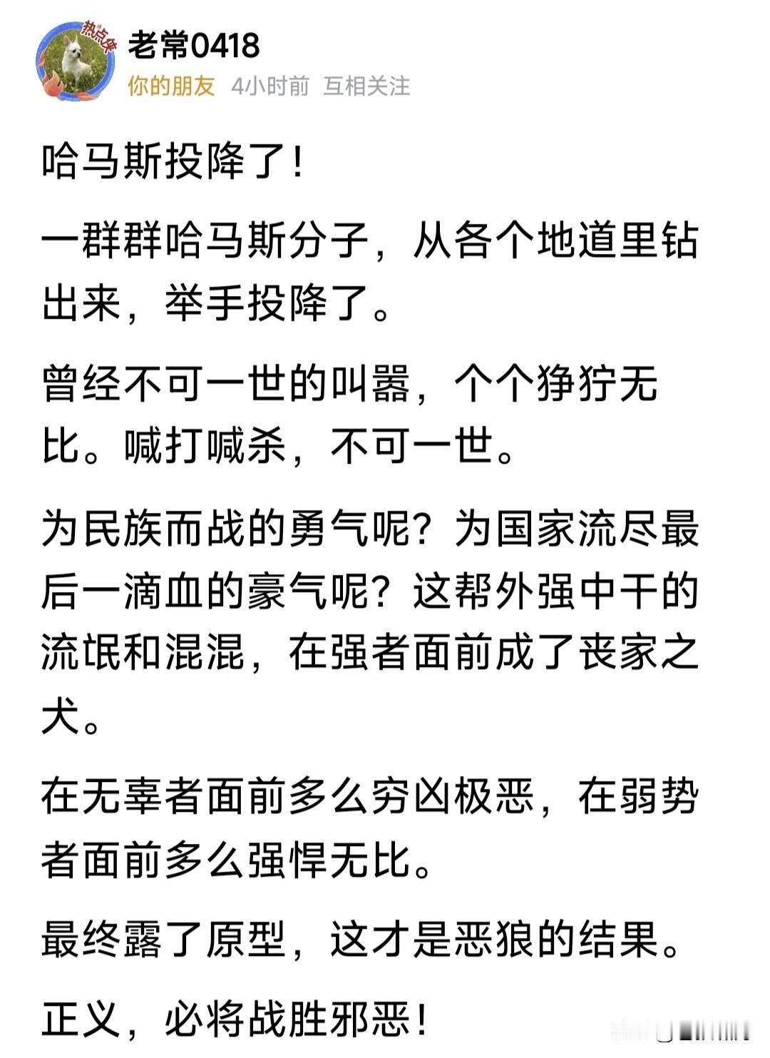 一个时代终结落幕!哈马斯解除武装,赤身走出地道投降。高层“出卖”下层士兵,换得苟活逃命,但谁能保证不被摩萨德追杀?下层士兵何以为命? 看到这样的情景,令人想到10.7恐袭!那狂射5千枚火箭弹的嚣张,那1500名翼伞勇士的疯狂!两年前的不可一世凶狠歹毒,已经注定今天的命运! 1200名以色列无辜平民,国际和平音乐节友人的冤魂!520名被劫持绑架的各国人质,两年多非人折磨什么惨遭杀害的仇怨!终于得报苍天有眼! 是谁幕后指使,导致这场骇人听闻的大屠杀?哈马斯的下层士兵,知道为什么而战吗?他们舍命拼杀的时候,知道他们的首领正在国外享受奢华吗? 苍天有眼,多行不义必自毙!哈马斯有今天的结局,是他们野蛮恐怖,邪恶分裂,与文明潮流对抗必然结果! 不知那些曾经上窜下跳摇旗呐喊,大声疾呼支持“哈真胡伊”的哈棍哈拳们,此时在想什么呢?怎没人说话呢? 最后想送给这些网友一句话:世界潮流浩浩荡荡,与文明正义同行,不与野蛮邪恶为伍。方能赢得世界尊重! 中华民族伟大复兴,机遇千载难逢!牢牢把握大方向,融入文明世界,携手合作共赢,扬帆远行实现中国梦! …………