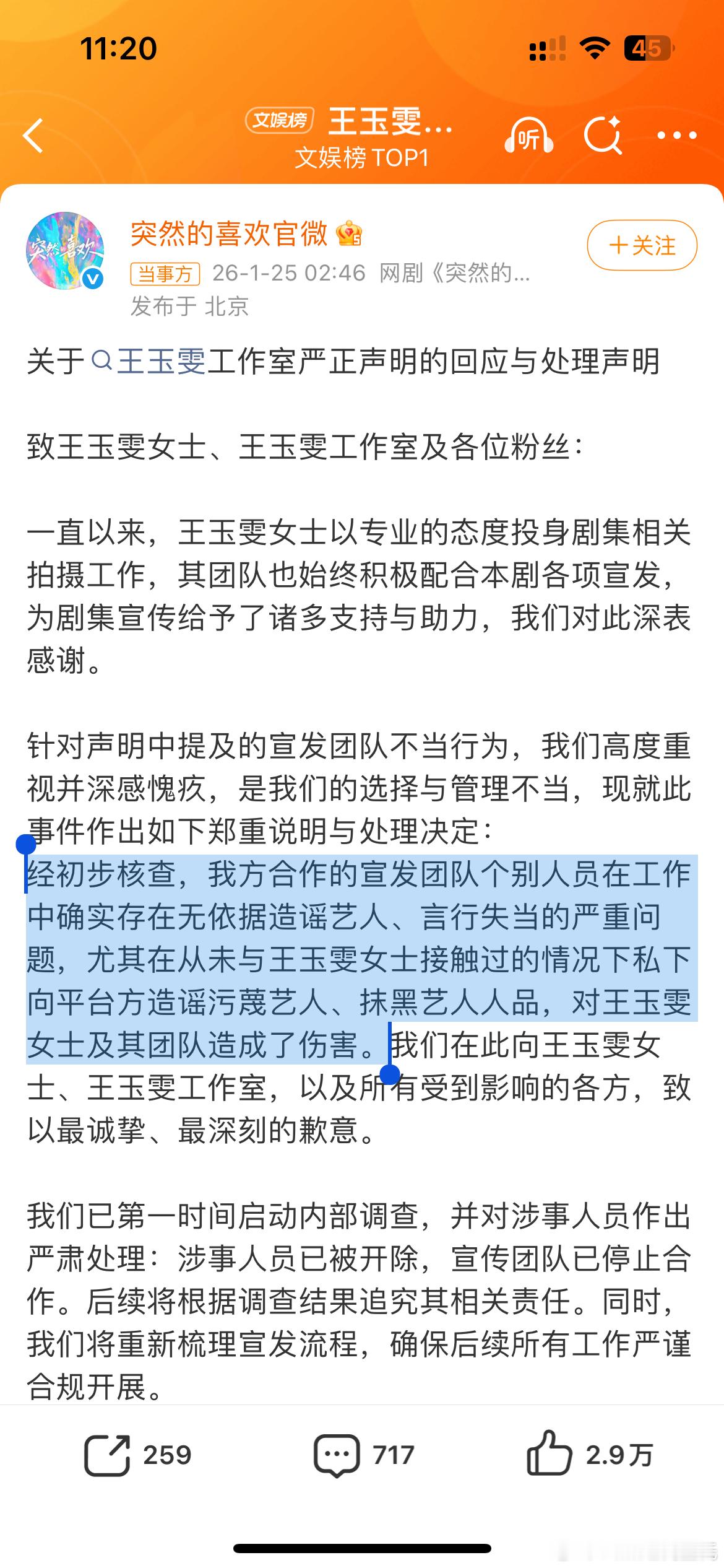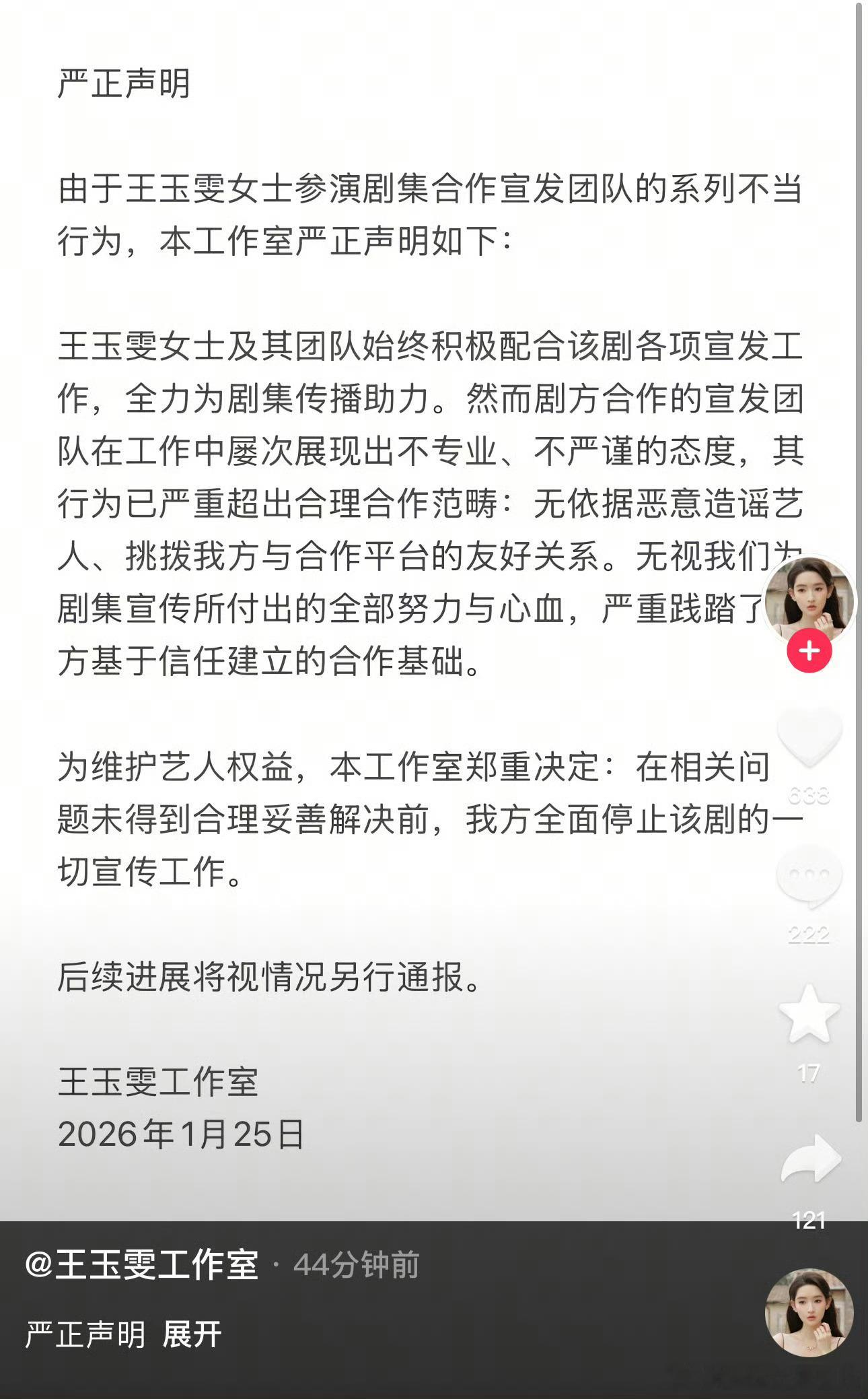 王玉雯方停止突然的喜欢一切宣传工作我去,宣发团队真是抽象,向平台方造谣……而且剧方承认确有其事,并已经开除……经初步核查,我方合作的宣发团队个别人员在工作中确实存在无依据造谣艺人、言行失当的严重问题,尤其在从未与王玉雯女士接触过的情况下私下向平台方造谣污蔑艺人、抹黑艺人人品,对王玉雯女士及其团队造成了伤害。王玉雯方停止突然的喜欢一切宣传工作