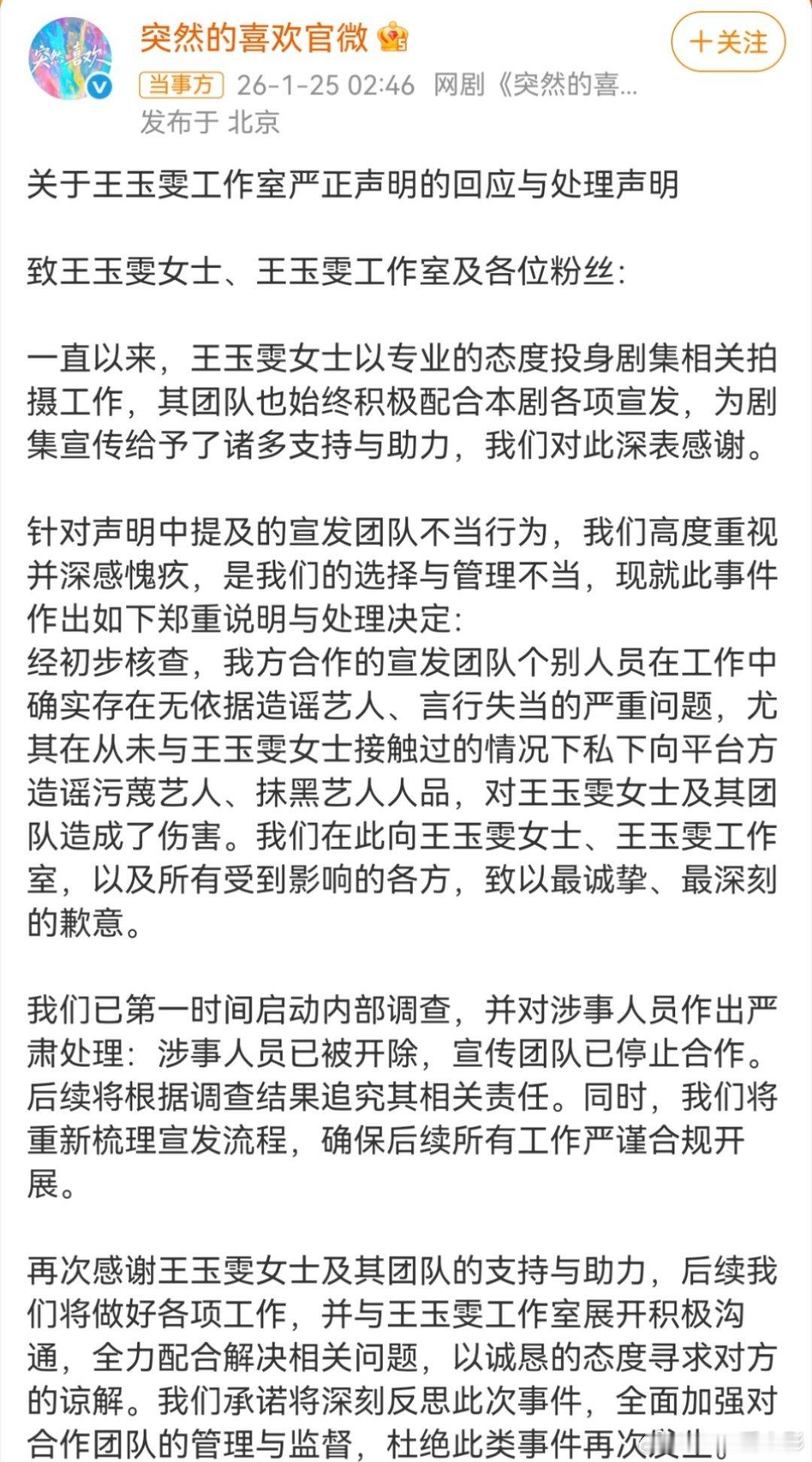 王玉雯方停止突然的喜欢一切宣传工作《突然的喜欢》剧方宣传人员造谣王玉雯,王玉雯方暂停一切剧方宣传工作据说是因为抖和微博平台发的宣传条数问题…