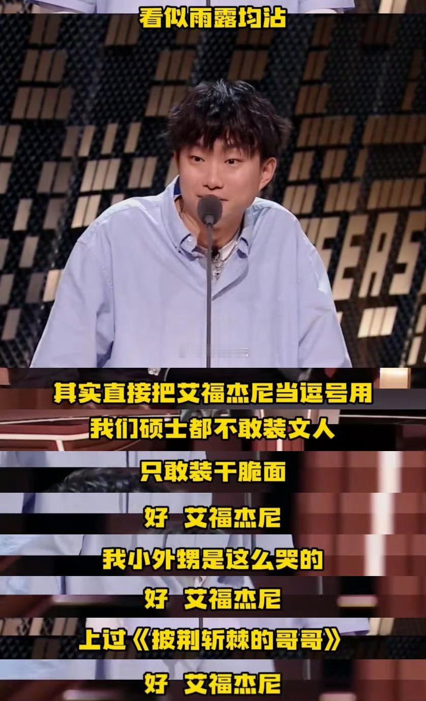 艾福杰尼 你到底是个什么玩意 笑不活了!艾福杰尼上《主咖和Ta的朋友们》的原因太真实~直面脱口秀蹭说唱的话题,他的回应“狮子不会因为狗叫而回头,除非狗给的太多”气场拉满,rapper跨界脱口秀主咖,嘴炮实力直接拉满,这波名场面预定!