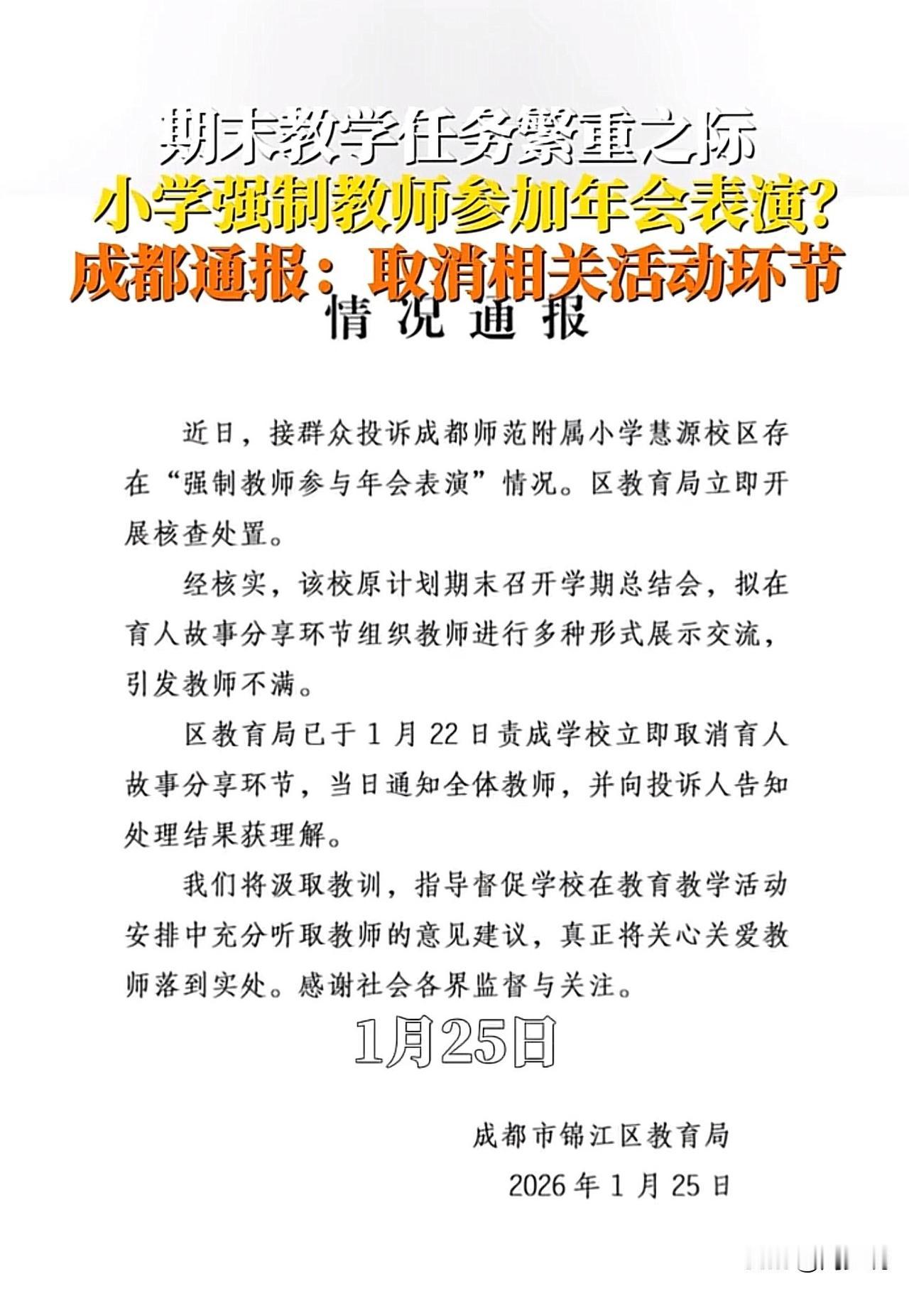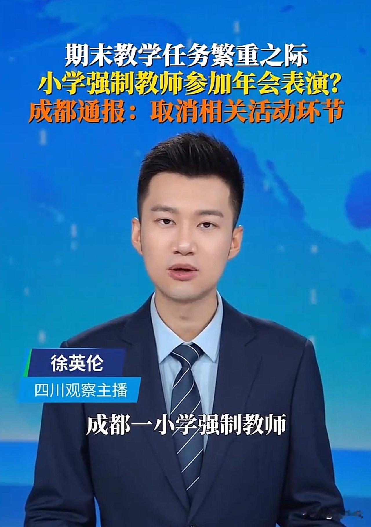 #教育局通报小学强制教师年会表演#“紧急叫停!”近日,成都一小学强制教师年会表演引投诉,教育局紧急叫停取消相关环节。据悉,该校原计划在学期总结会的育人故事分享环节,要求教师进行多种形式展示,可期末本就是课程总结、学生评价、家长会扎堆的关键期,额外排练让老师们身心俱疲。 针对此情况,网友纷纷留言:“老师的核心是教书,不是当演员啊,非教学负担该减减了”! 也有网友更是表示:“强制参与太没人情味,连休息时间都占用,怎么能安心备课?” 看完这事,周少觉得被教育局取消相关环节,一点都不意外。学校初衷或许是丰富活动,但忽略了教师的真实需求,反而还增加了教师的负担,更违背了教育管理的人文底色。 而且,教育的本质是“育人”,唯有让教师卸下不必要的包袱,才能让他们把精力聚焦在课堂上。不得不说教育局的快速处置值得肯定,但更要建立长效机制。 周少建议学校管理不妨多些“南风法则”,少些刚性管控,重大决策前多听听教师的声音。毕竟,只有当教师感受到被尊重、被关怀,才能真正激发教学热忱,这才是教育该有的样子。#寻美三湘# #长沙新朋友#