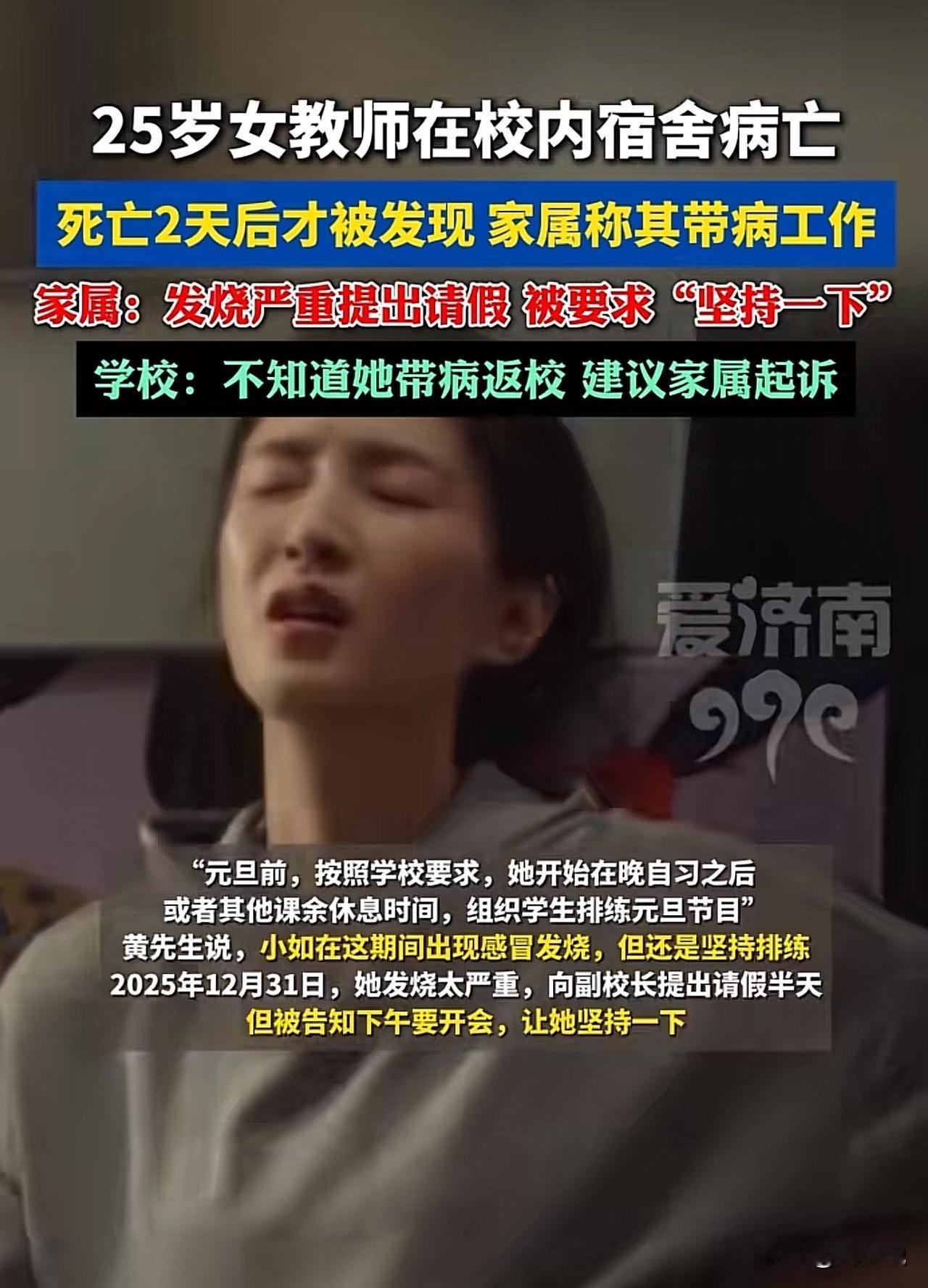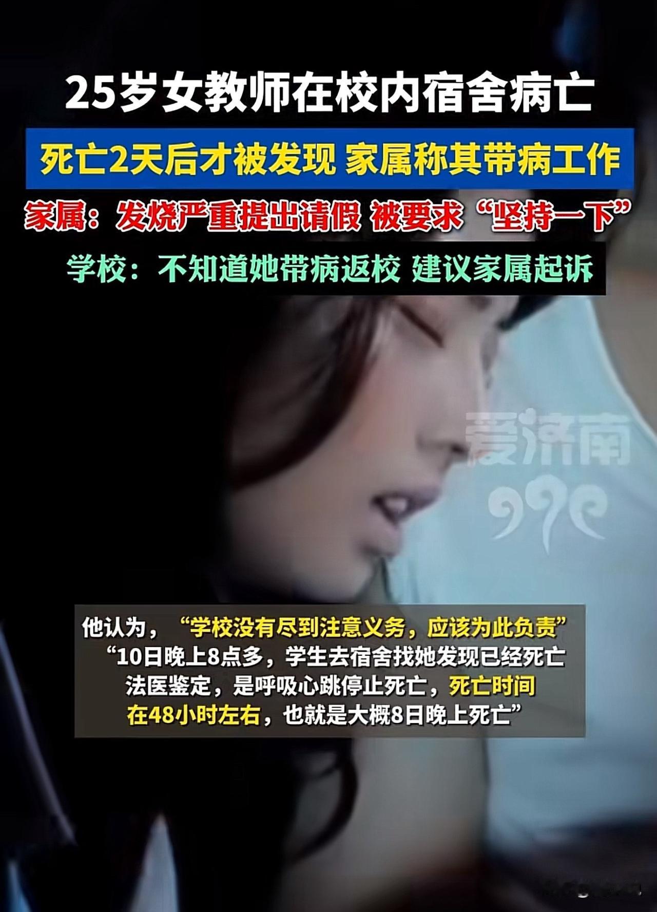 #女教师校内宿舍病亡两天后才被发现#“看得真让人心里发堵!”近日,安徽毫州一位25岁的女教师,元旦前就带病工作,节后拖着病体返岗,却在学校宿舍离世,两天后才被学生发现。法医鉴定死亡时间约在8日晚,可7、8号都是工作日,同住校内的她没上班,学校竟毫无察觉。而校方回应称,“人员多、办公室分散,不知道她返校”。 此事曝光后,网友炸开了锅。有网友当即质疑道:“校内住宿、两天缺勤,就算管理再松,也该有个过问吧?” 也有网友表示:“年轻老师带病硬扛,学校连基本的关怀都没有,太让人失望了!” 在周少看来,这起悲剧看得真让人揪心,甚至是心里发堵。一个年轻的教师,没想到突发意外在学校宿舍离世,真惋惜。 客观的说,当下年轻教师群体压力本就不小,非教学任务、考核指标常常压得人喘不过气,不少人都有过带病工作的经历。 学校作为管理者,不能只谈责任划分,却忽视了最基本的人文关怀。哪怕有同事多一句问候,有行政人员多一次巡查,或许就能避免这场遗憾。 这事也给所有学校提醒,教师的健康真不容忽视,更应该建立完善的在岗监测机制,对缺勤人员及时跟进。让教育行业在追求成绩和效率的同时,多些温度与关怀,别让年轻的生命再为忽视买单。 当然,作为教育工作者,心里也要有一杆秤,敬业不是硬扛,健康永远是底线。 #长沙新朋友# #寻美三湘#