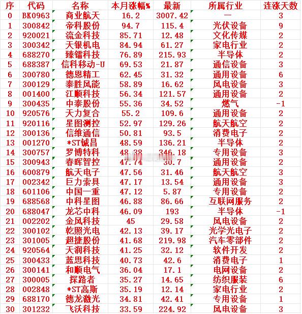 卫星互联网概念,一月以来涨幅最多的30名单汇总一览商业航天(板块指数):本月涨幅 +16.20%,连涨 3天帝科股份:本月涨幅 +94.70%,最新价 115.40元,连涨 9天流金科技:本月涨幅 +85.71%,最新价 12.48元,连涨 2天天银机电:本月涨幅 +84.94%,最新价 61.27元,连涨 2天臻镭科技:本月涨幅 +76.89%,最新价 215.93元,连涨 2天信科移动-U:本月涨幅 +69.53%,最新价 21.87元,连涨 3天德恩精工:本月涨幅 +62.45%,最新价 31.32元,连涨 6天泰胜风能:本月涨幅 +58.89%,最新价 16.62元,连涨 3天江顺科技:本月涨幅 +56.34%,最新价 121.57元,连涨 2天中泰股份:本月涨幅 +55.36%,最新价 34.52元,连涨 -1天天力复合:本月涨幅 +55.20%,最新价 109.60元,连涨 2天周雨彤 观众缘