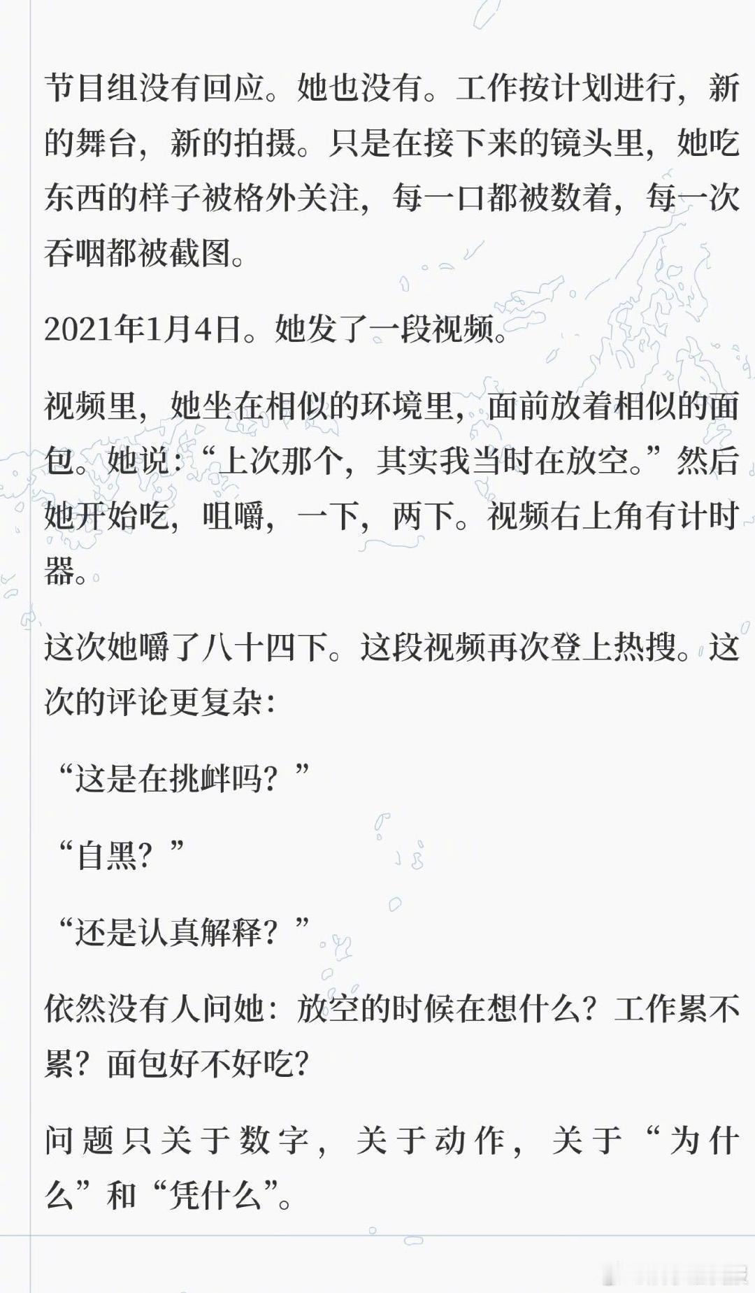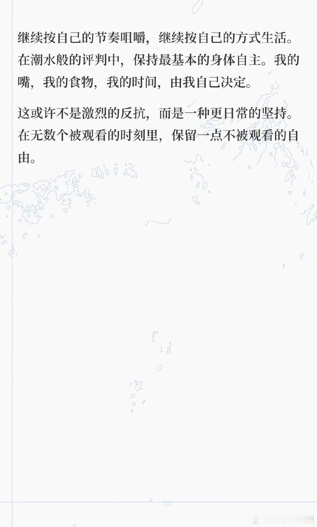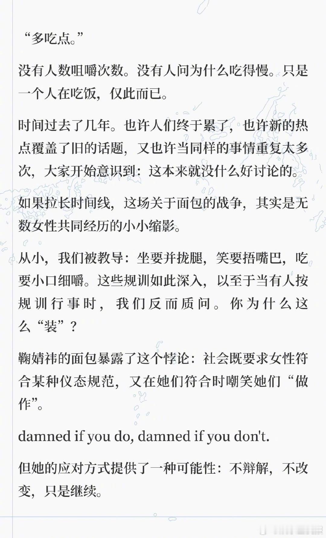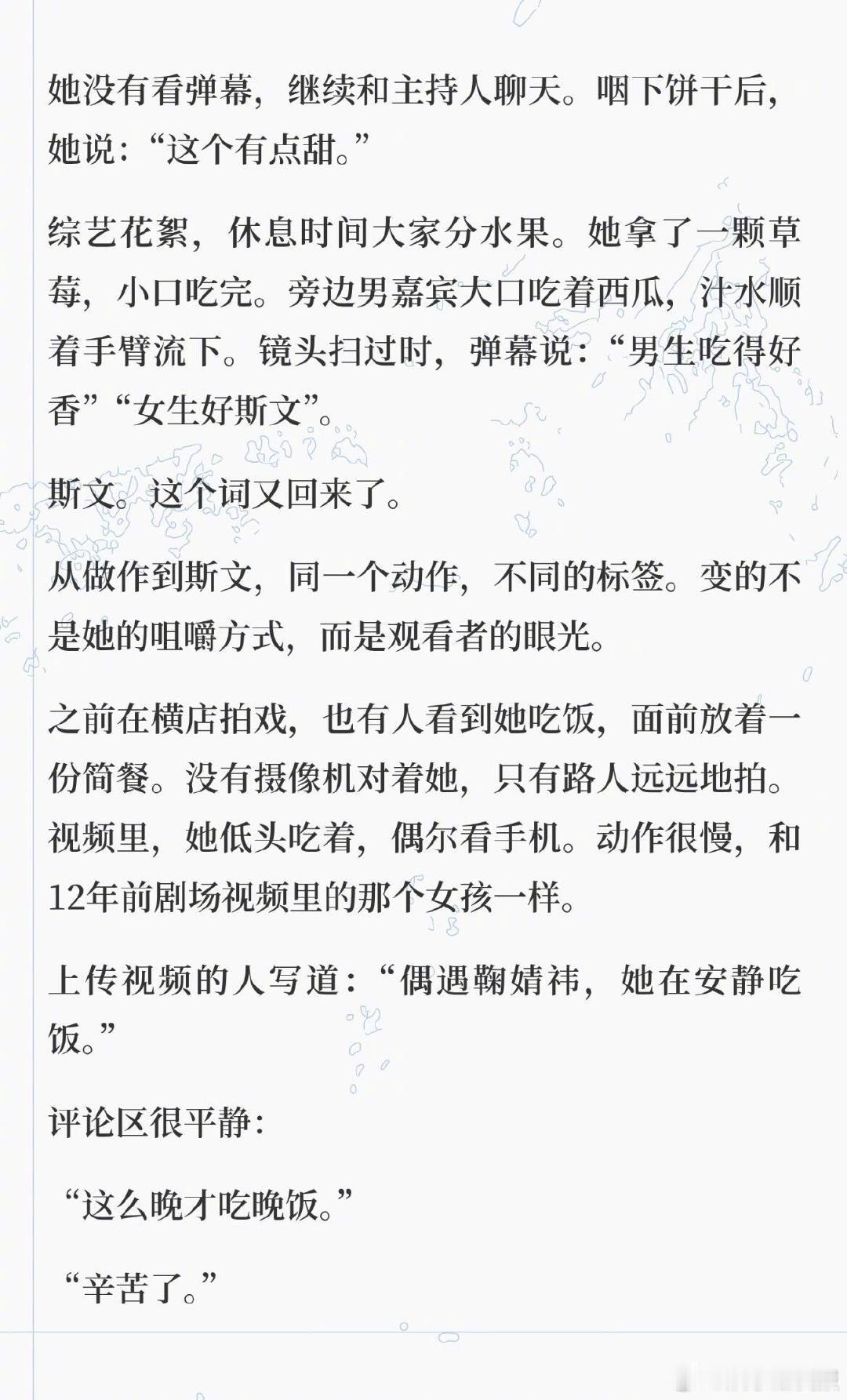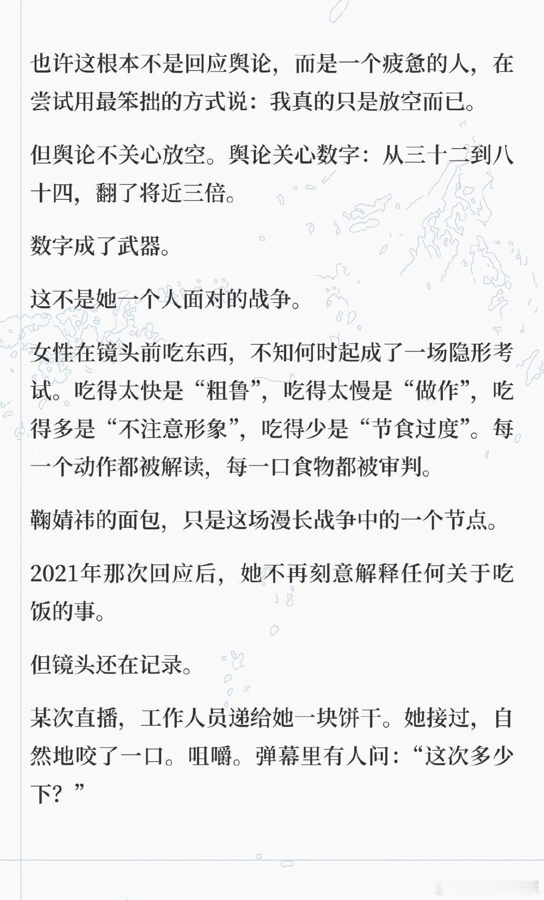 鞠婧祎 不辩解不改变只是继续鞠婧祎 你可以慢慢吃东西 看完博主 为鞠婧祎写的长文,愈发觉得她的清醒难能可贵:一口面包嚼 32 下被批 “刻意做作”,坦诚是放空嚼了 84 下又遭质疑 “故意挑衅”,可她从没被流言裹挟 —— 直播时自然咬下饼干笑着说 “有点甜”,片场安静吃简餐的模样,反倒收获了网友 “多吃点” 的温柔留言。社会总爱给女性的饮食节奏贴标签,“吃太慢显装、吃太快失礼” 的枷锁从未消失,但鞠婧祎始终不辩解、不迎合,只守住 “我的节奏我做主” 的自在。这种在漫天评判里坚定守护身体自主的日常,比任何声嘶力竭的反抗都更有力量