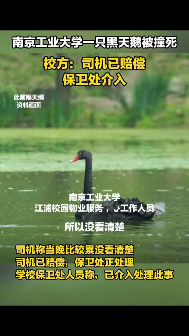 南京工业大学一只黑天鹅被撞死,校方:司机已赔偿,保卫处介入。 近日,南京工业大学一黑天鹅被汽车撞倒,视频引发热议。 1月24日,南京工业大学江浦校园物业服务中心人员称,天鹅被撞后死亡,司机称当晚比较累没看清楚,司机已赔偿,保卫处正处理。学校保卫处人员称,已介入处理此事。