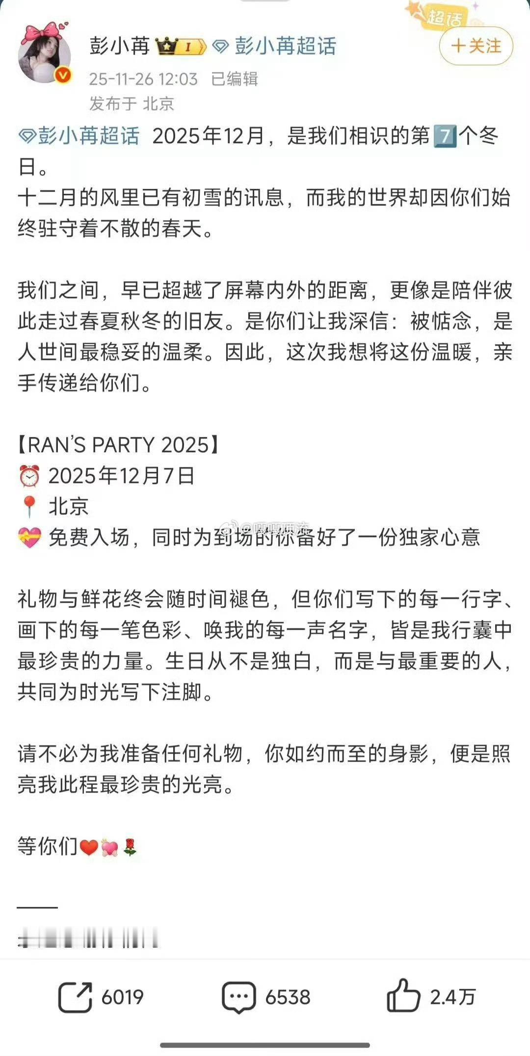 彭小苒 真诚 谁能不爱温柔又真诚的彭小苒! 机场再拥挤也始终保持耐心,温柔叮嘱粉丝注意安全,感冒了依旧用心回应每一份爱意,签名、送祝福、夸粉丝样样不落,深夜还会认真翻看粉丝的手写信。她从不吝啬给予粉丝温暖,用真心换真心,这样的宝藏女孩值得被全世界温柔以待,愿她在热爱里绽放,前路繁花似锦!