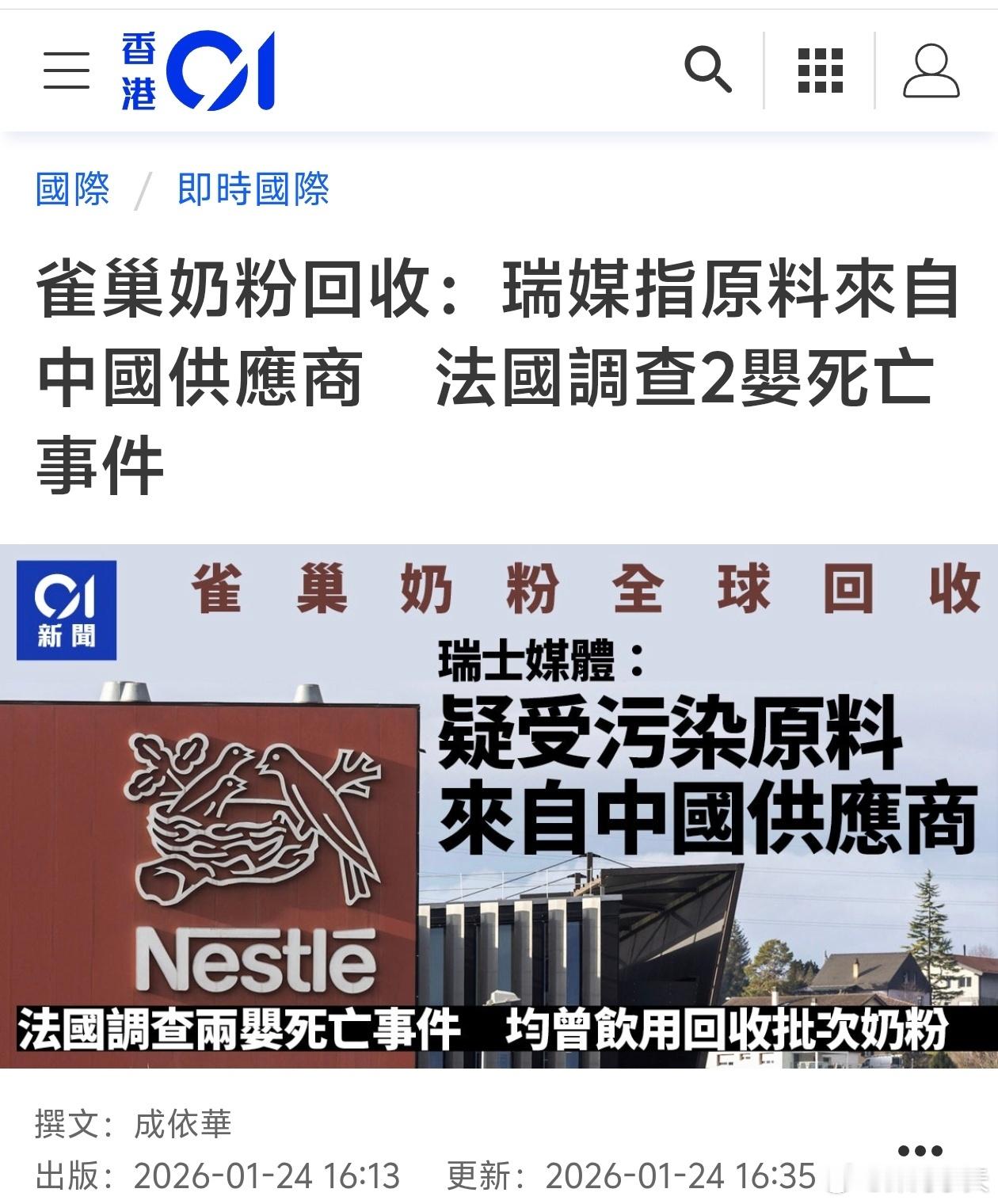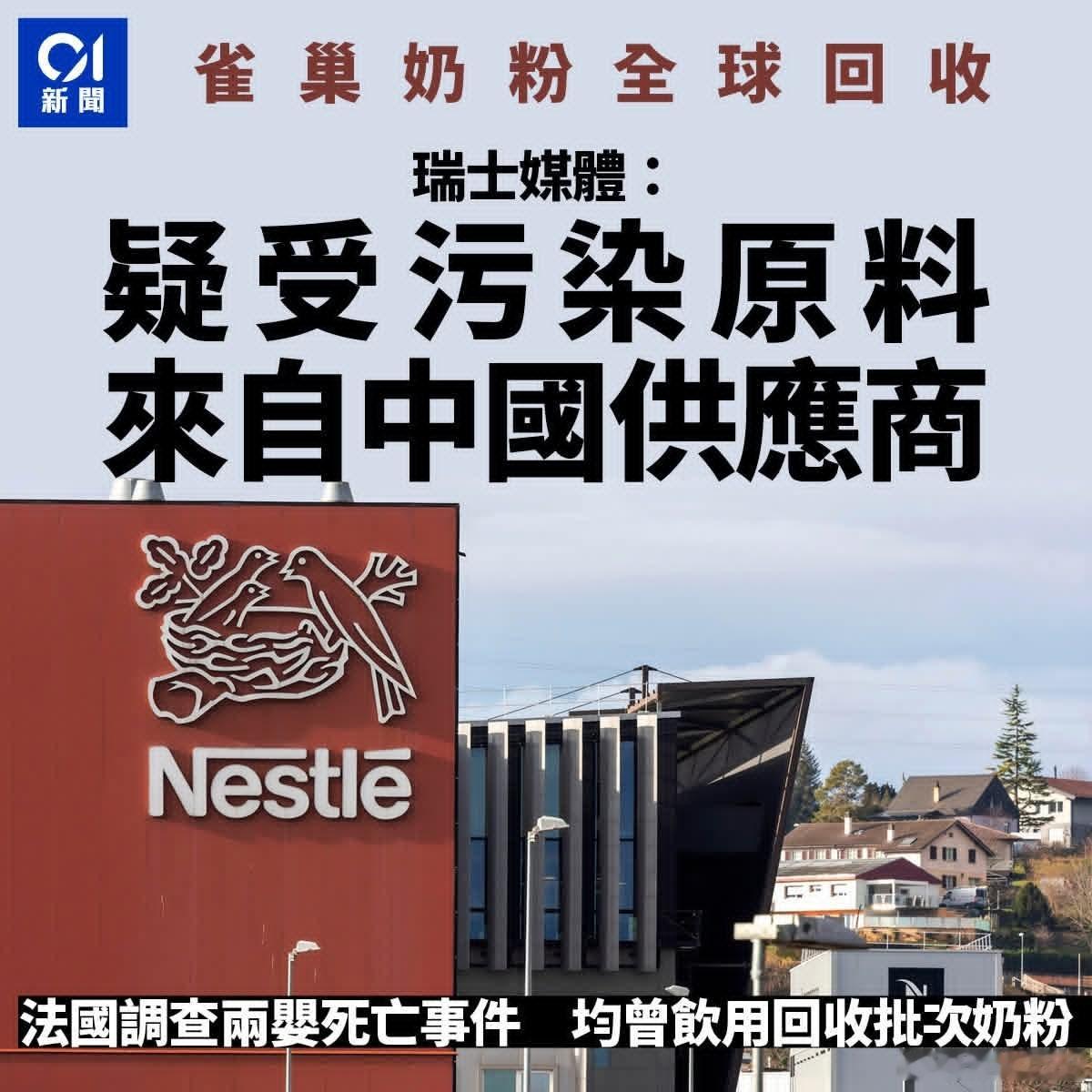 雀巢毒奶粉疑致2婴儿死亡,瑞士甩锅中国由于产品或受蜡样芽孢杆菌污染,总部位于瑞士的雀巢(Nestle)1月初宣告召回在全球多个地区的部份批次婴儿奶粉,瑞士媒体《每日广讯报》1月22日指责,毒奶粉使用的受污染原料是,疑似来自一家中国供应商。法国卫生部1月23日则宣告调查两宗婴儿死亡事件,他们均曾饮用如今回收的婴儿配方奶粉,目前未有证据显示死因与奶粉有关。据法媒指,有关奶粉品牌为雀巢旗下的Guigoz。供应商回应雀巢奶粉召回美俄乌三方会谈下周继续举行
