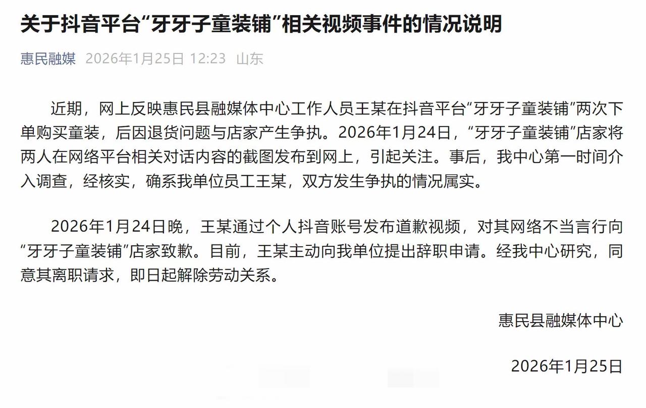 为了白嫖59元童装的这位山东王女士,这下亏大了!原来这位王女士还是位记者,恶意退货被商家曝光后,不仅丢了工作,地址和聊天记录也被曝光,已社死! 这位山东王女士,11月21日在牙牙子童装店铺下单了一件90尺码的童装,12月28日,又来该店铺下单了同款的110尺码。 12月30日,王女士申请退货退款,1月1日王女士催促商家退款,商家称还没有收到货,所以没有退。 等包裹收到后,商家在监控下第一时间打开了包裹,打开后发现衣服穿的非常脏,并且退回的是很早就买的90码的。 于是商家将衣服退回,拒绝了退款,这中间王女士申请了6次售后,平台都是支持卖家的。 这期间王女士一直追着店主骂,说了很多难听的话,最后一次申请售后时,因为超时没有拒绝退款,所以系统自动将钱退给了王女士。 退完款之后,王女士大半夜又来找卖家,用了很多不堪的语言。 商家气不过,称就算店铺不开了,也要将事件曝光出来,视频里的商家一边流泪一边讲述。 事件发酵后,王女士的单位也很重视,立刻进行调查,目前已经发了公告, 称王女士已经主动向单提出辞职,劳动关系已经解除。 另外,王女士也在网络上发布了向商家道歉的视频,但视频里的王女士脸上丝毫没有看到后悔的歉意,称是因为孕期抑郁,情绪不好,才说出了很多不当的言论。 不管这位王女士是真心也好,假意也罢,总之她这次是丢人丢大了! 网络购物本是为大家提供方便的,规则需要大家共同遵守,这些损人不利己的人,就该得到惩罚,支持商家正义维权!