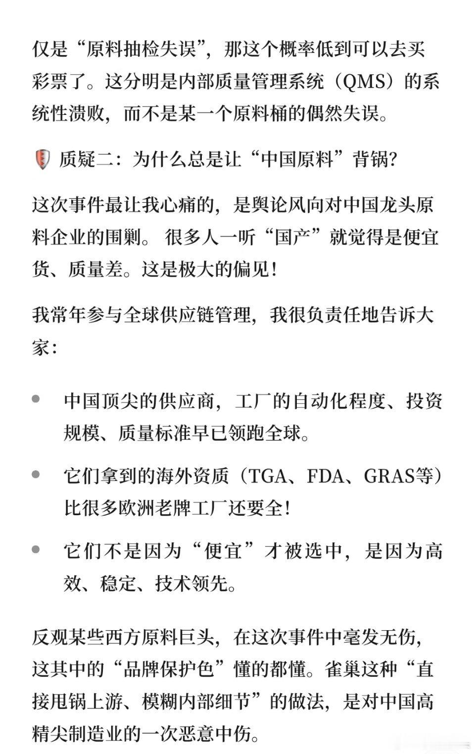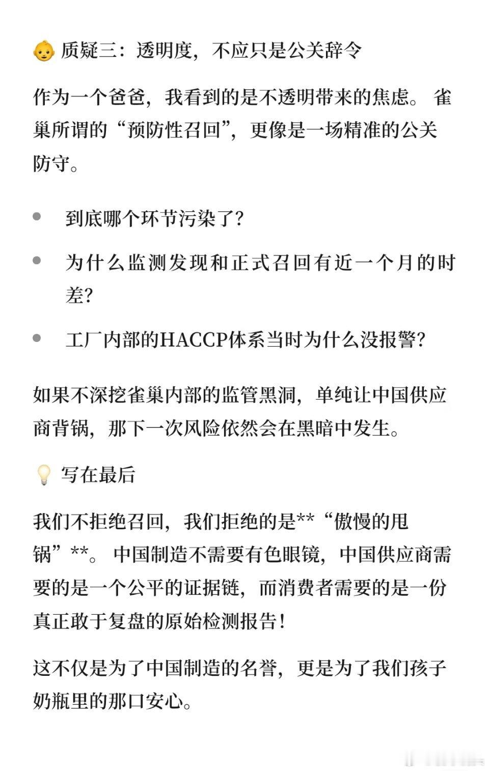 寰球镜头要说原料有问题,难道一开始接收原料的时候没有抽查吗?品控都没有吗?这是不符合逻辑的。最终的结果是产品有问题,雀巢在全球召回问题奶粉。所以大家不要迷信所谓的外国奶粉。外国毒奶粉多了去了,就比如日本森永,就算发生食品安全问题,公司照样好好的。选择国产奶粉,万一出问题了,至少公司能给他搞没,能得到赔偿。