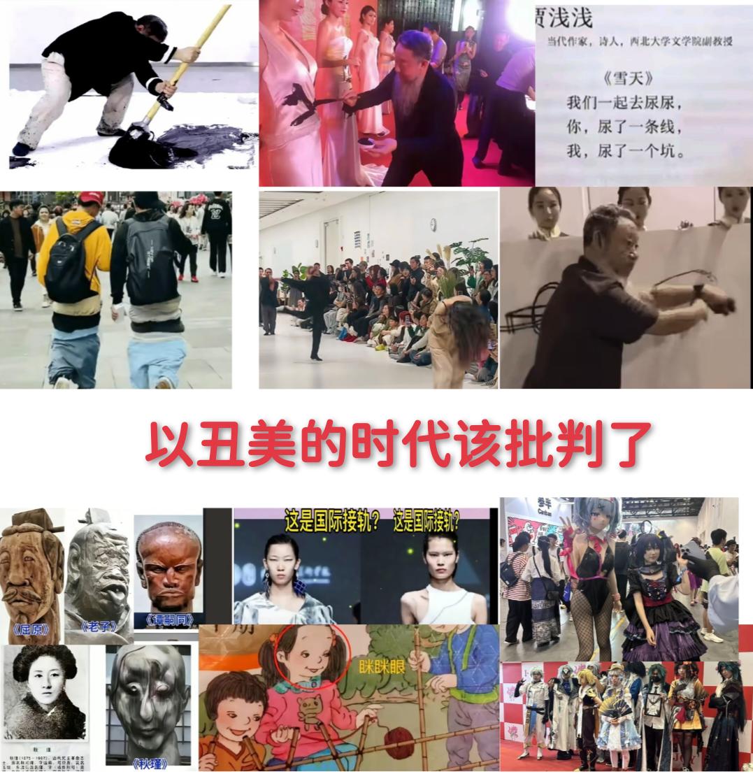 书画界、文艺界等领域,二十年来,我们目睹了诸多离经叛道的现象,诸如丑书、丑画、丑雕、丑人、丑文、丑歌、丑衣、丑妆、丑行、丑嘴、丑脸。 一言以蔽之,他们以丑为美,美其名曰创新,实则是在极力丑化中国人、丑化中国历史,践踏我们的传统文化。很多人吃着中国饭,却砸中国的“脸”。全民觉醒,不再受这些所谓的艺术家糊弄了,是时候拨乱反正了! 不详尽的地方,请条友补充,你还发现了那些脱离大众的奇怪现象!