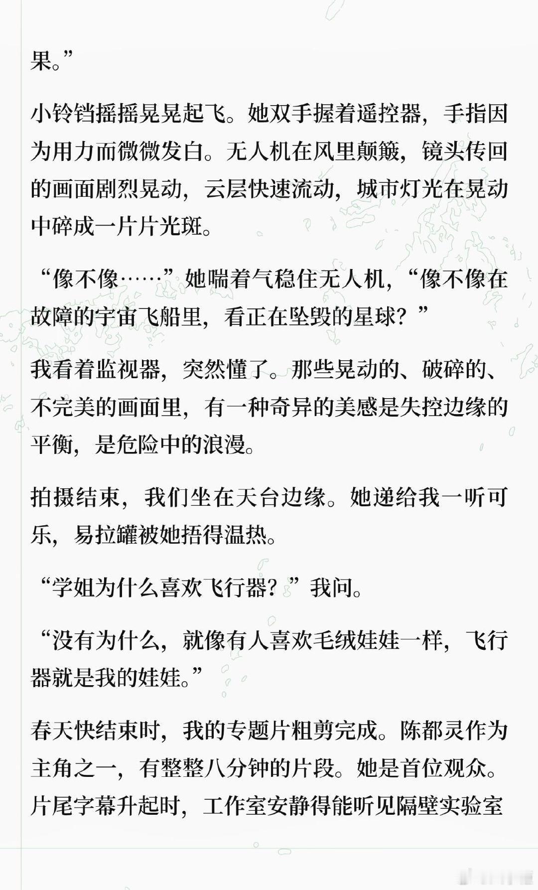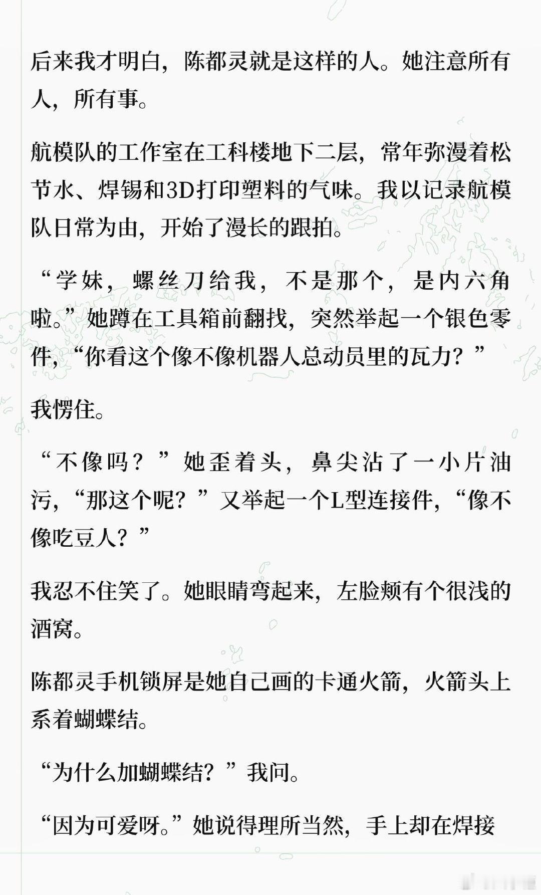 假如陈都灵真的在南航造飞行器 刷到博主 写的陈都灵 “梦女文”,直接被戳中少女心 !“航模队里唯一的女生陈都灵,穿洗得发白的队服,指尖还沾着淡淡的机油痕迹,讲起碳纤维加强肋时语气温温柔柔,却能精准挑出拍摄的光线问题;会把零件盒称作‘梦想的补丁’,手机锁屏是带蝴蝶结的卡通火箭,焊铝板时火花溅得满脸也眼神笃定......” 这样又飒又软的工科少女嘟嘟,谁遇到能不心动啊 !