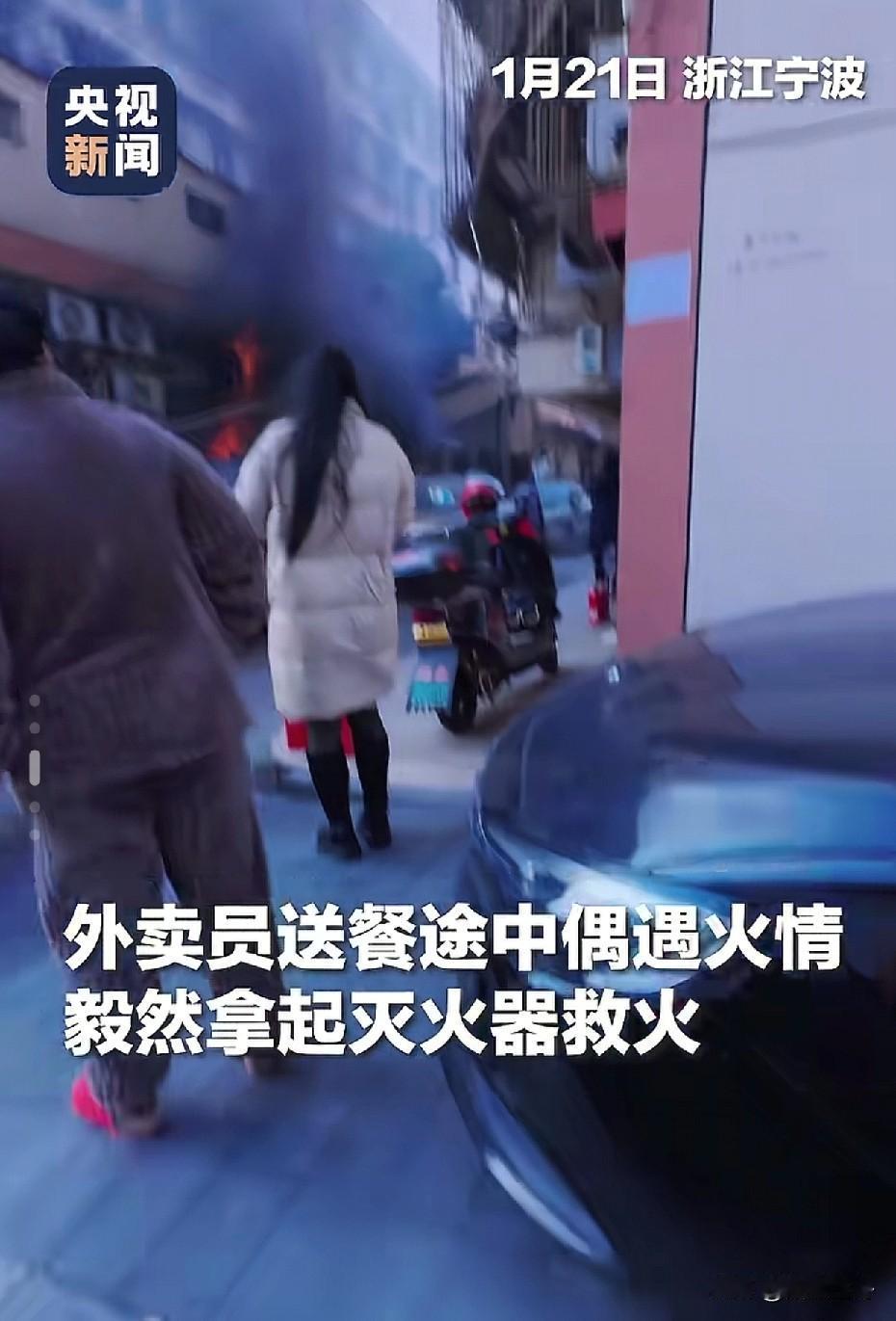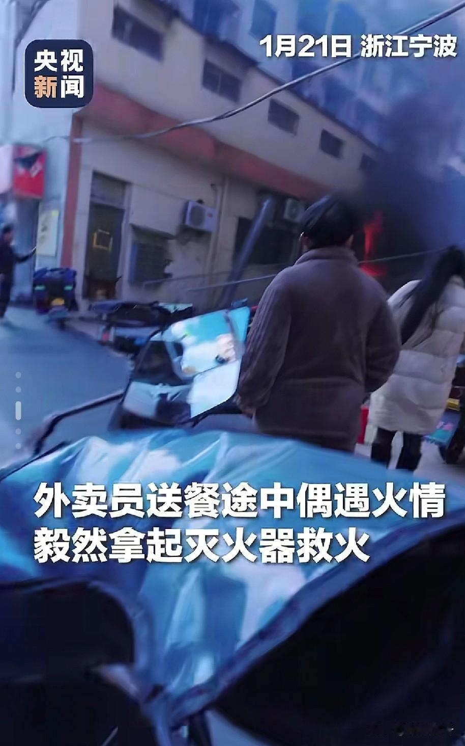 抱歉!您的骑手正在灭火! 外卖小哥解锁新技能,反应迅速、手脚麻利、还挺专业,邻居调侃还以为是消防员了![捂脸] 1月21日下午,宁波一小区内发生火灾,现场火光四溅并伴有大量浓烟冒出,居民们纷纷向外撤离。 危急时刻22岁的外卖小哥杨毅送餐恰巧路过,他二话没说拿起灭火器冲进火场展开救援。 由于火势太大灭火器根本就没有效果,他从保安手里抢过从未使用过得水枪,大喊“快开水阀”,他抱着水枪对准火源一顿操作,由于水势凶猛自己全身也被淋透。 整个过程外卖小哥表现的非常出色,专业又勇敢,为营救争取了宝贵时间,等到消防员赶到时,火势基本被控制。 而外卖小哥默默的骑上电动车离开,手中还有两单外卖还没有送完,肯定是超时了希望顾客不要投诉他! 为勇敢的外卖小哥点赞![赞] [赞]宁波外卖员 骑手救火 小哥灭火 小哥救火