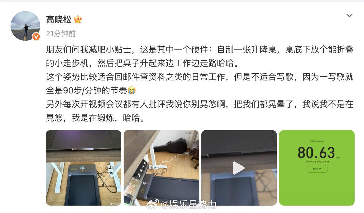 高晓松为减肥自制升降桌跑步机高晓松分享减肥技巧 高晓松分享减肥巧思,自制升降桌搭配桌下走步机,边办公查资料边走路燃脂,还调侃写歌节奏都跟着步速走,90步/分钟拿捏~开视频会议被吐槽晃悠,委屈解释 “我是在锻炼” 笑不活了