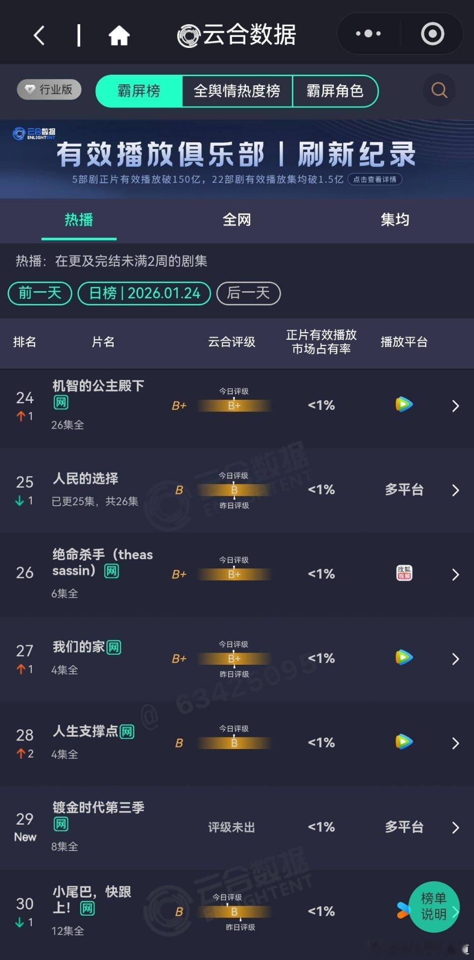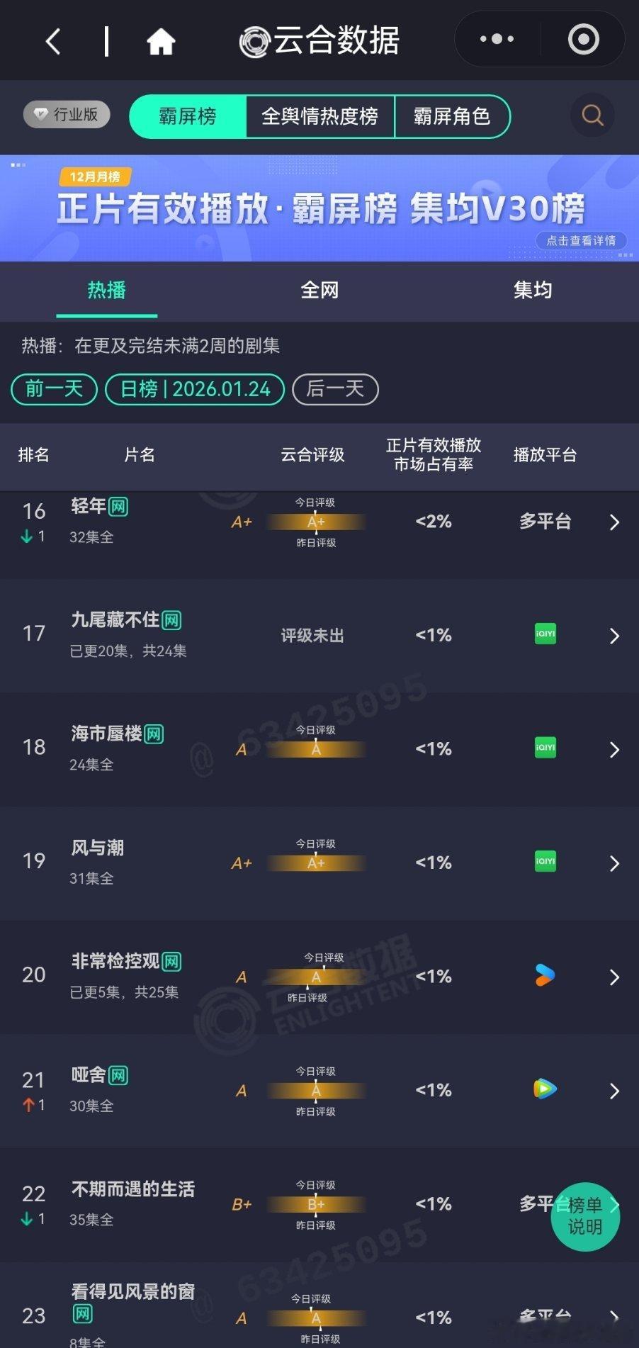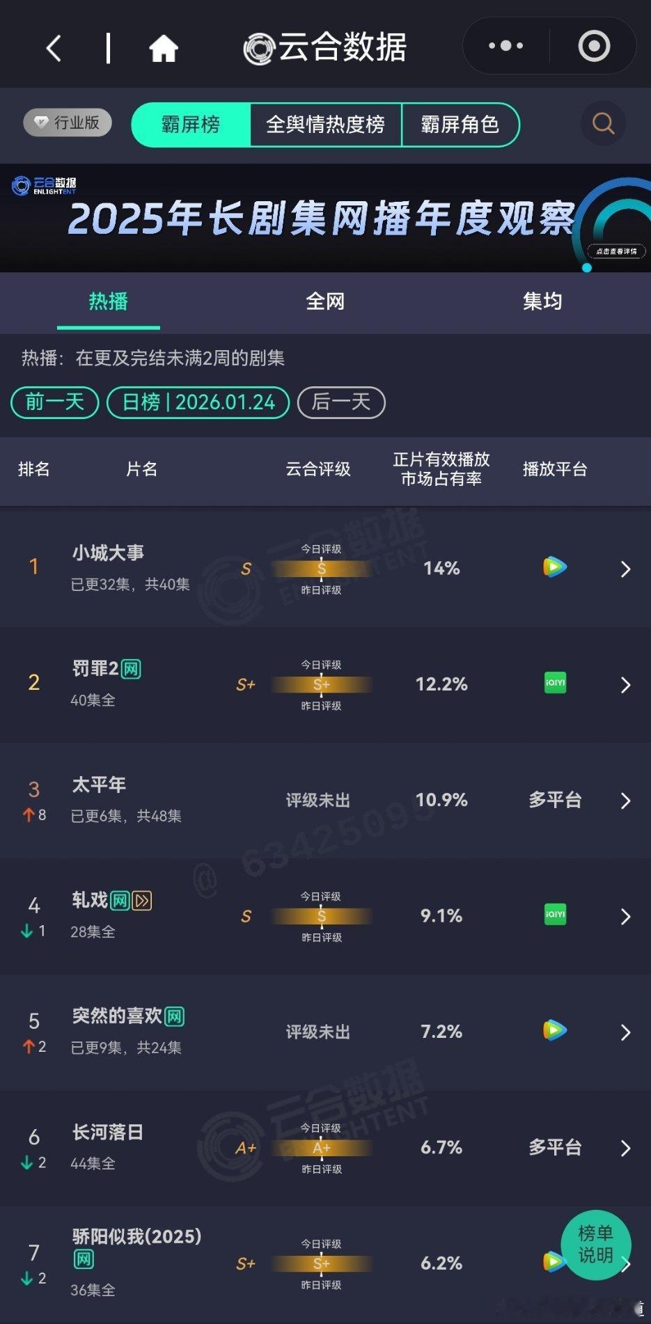 2026年1月24日云合播放占比云合 小城大事14%双更占比还降了,这个榜首估计明天就没了罚罪2 12.2%稳住了太平年10.9%翻倍成功,翻了三倍有余,如果是一个平台这是非常好的趋势,但是爱奇艺+腾讯+芒果,三个平台这个数据…,还得再看几天。轧戏9.1%突然的喜欢7.2%还可以
