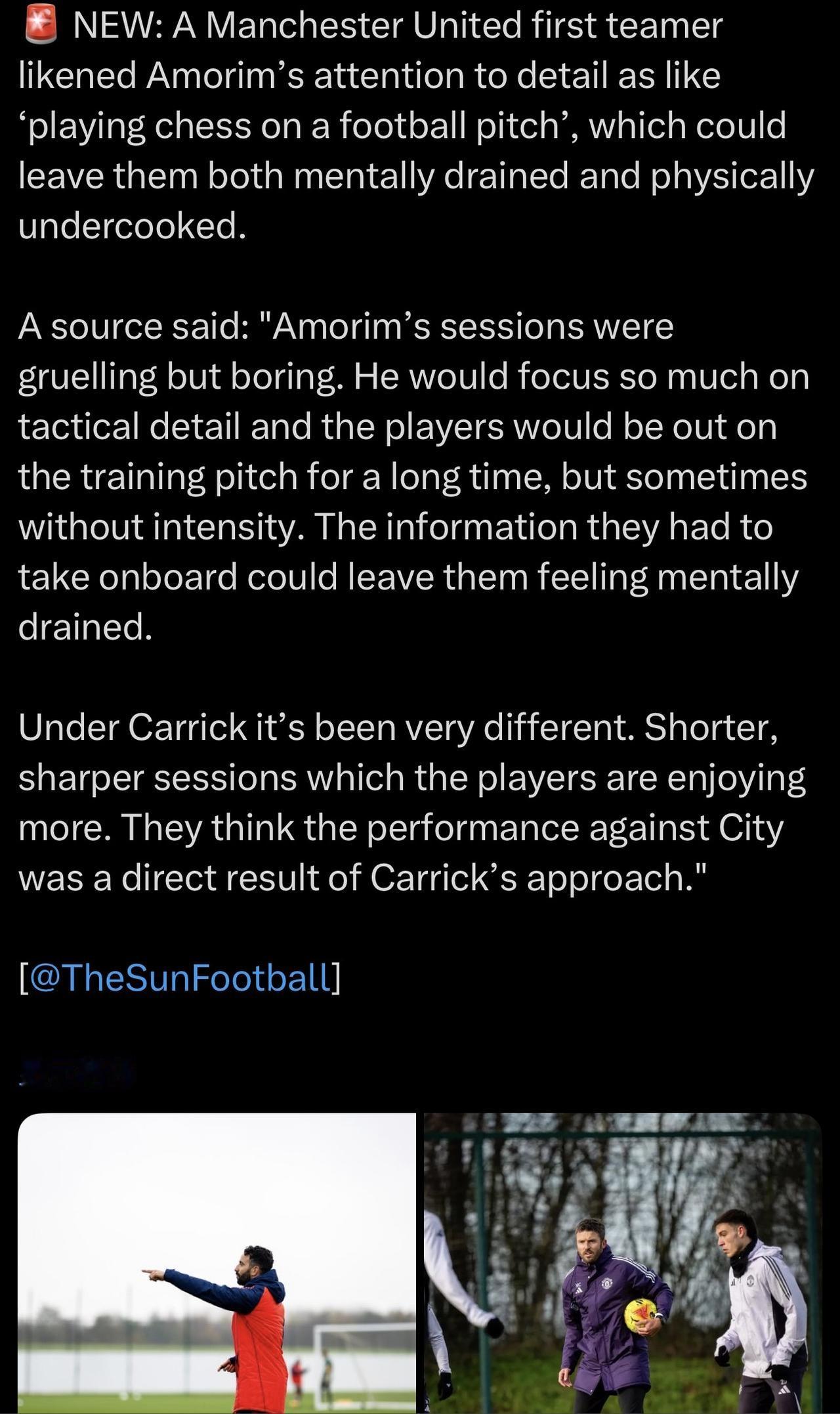 太阳报一个很有意思的报道,我看了其实很有感慨,踢球不单单是该用脑子还是用身体的简单命题。 ……………………………………………………………… 最新消息:一名曼联一线队球员将阿莫林对细节的关注比作“在足球场上下棋”,这可能会让他们精神疲惫,身体也未得到充分锻炼。 一位消息人士称:“阿莫林的训练课虽然很艰苦,但却很枯燥。他会非常注重战术细节,球员们会在训练场上待很长时间,但有时强度却不高。他们需要吸收的信息量之大,常常让他们感到精神疲惫。” 在卡里克的带领下,情况大不相同。训练时间更短,强度更大,球员们更喜欢这种训练方式。他们认为对阵曼城的出色表现正是卡里克这种训练方法的直接成果。