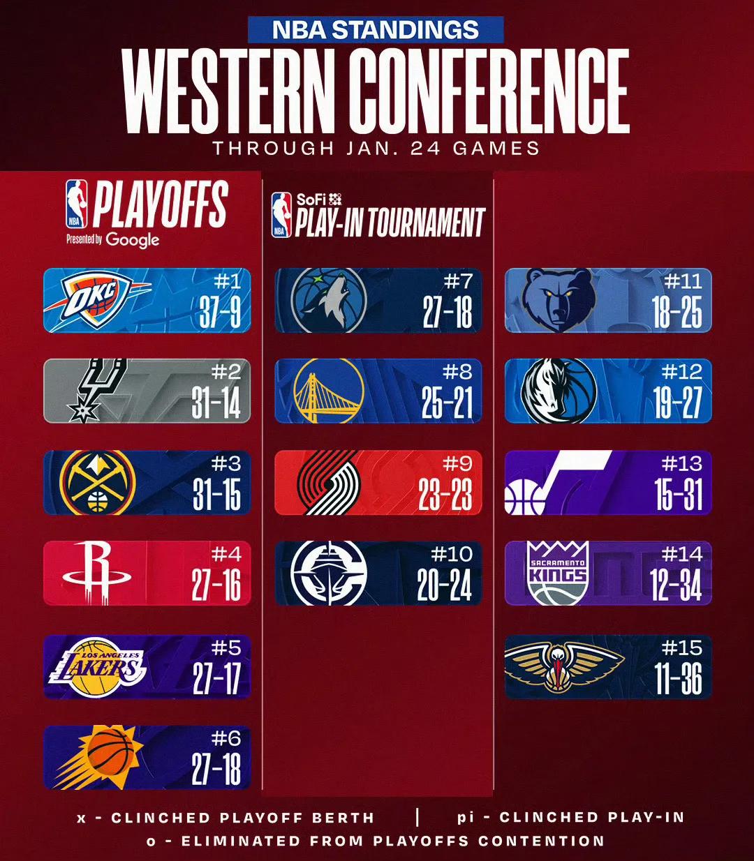NBA西部联盟排名分析如下: 一、季后赛直接晋级区(第1-6名) 1. 俄克拉荷马城雷霆:37胜9负 2. 圣安东尼奥马刺:31胜14负 3. 丹佛掘金:31胜15负 4. 休斯顿火箭:27胜16负, 5. 洛杉矶湖人:27胜17负, 6. 菲尼克斯太阳:27胜18负, 二、附加赛区(第7-10名) 明尼苏达森林狼(27胜18负)、 金州勇士(25胜21负)、 波特兰开拓者(23胜23负)、 孟菲斯灰熊(20胜24负) 三、无缘季后赛区(第11-15名) 达拉斯独行侠(19胜27负)、 犹他爵士(15胜31负)、 萨克拉门托国王(12胜34负)、 新奥尔良鹈鹕(11胜36负)已基本退出季后赛争夺,部分球队已开始着眼于下赛季重建。