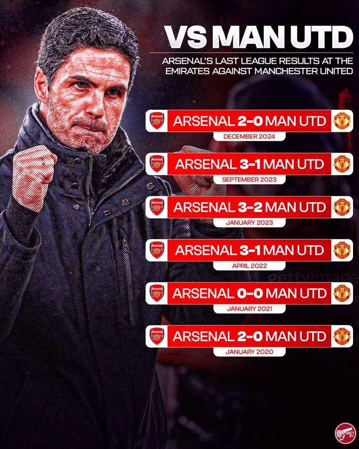 作为阿森纳主教练,阿尔特塔在酋长球场对阵曼联的联赛中从未尝败绩……5胜1平0负