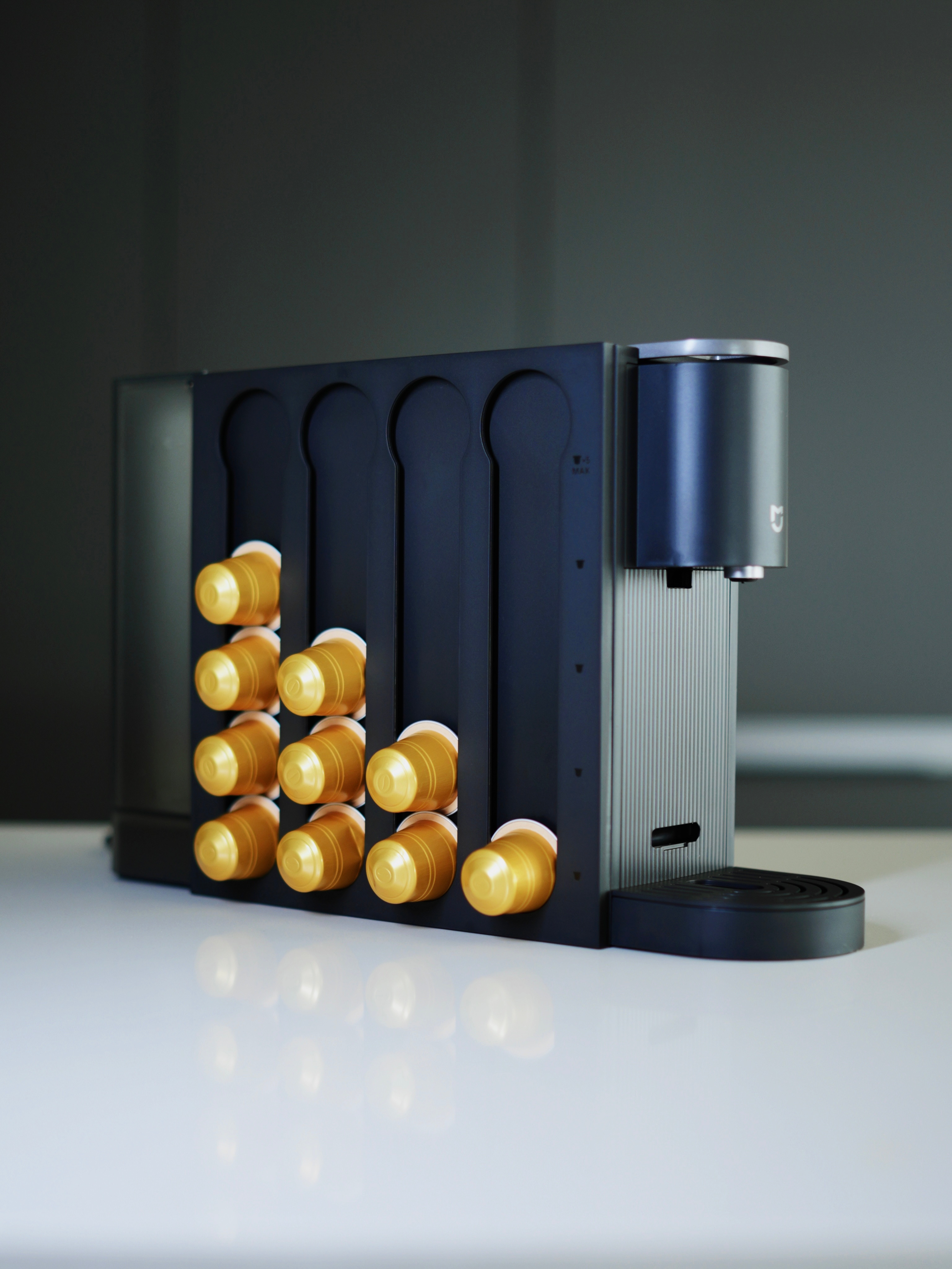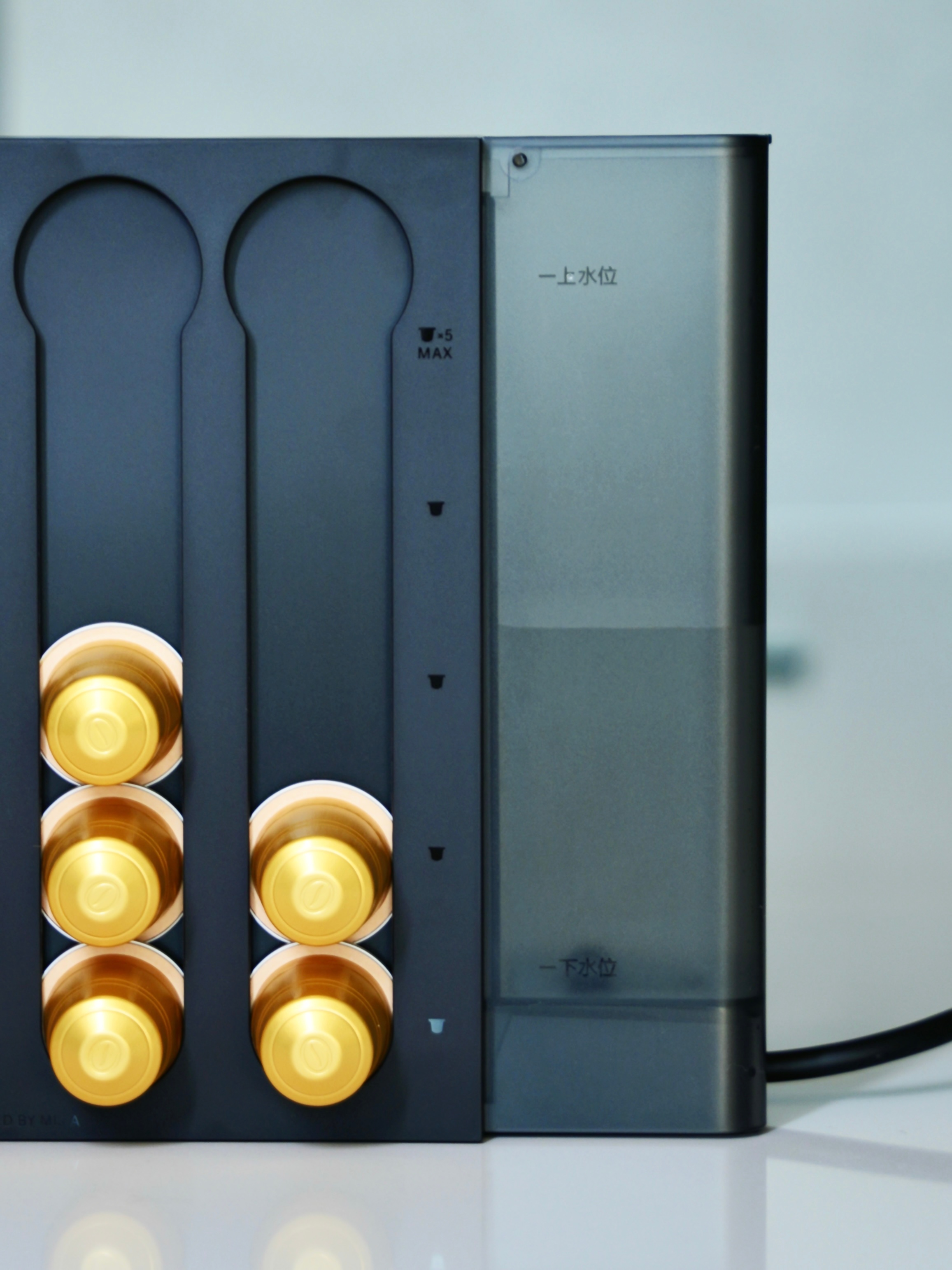 前段时间公司小伙伴天天吵着要咖啡机,说早上来了提神用,商讨过手冲、半自动咖啡机,最后还是败给了他们的懒。美名其曰一忙起来根本没时间磨豆调参数,于是就给他们入手了米家胶囊咖啡机S1,让他们真正实现了咖啡自由。尺寸不是很大,直接摆在角落,一点不占地方,甚至放在办公桌上都不突兀。最贴心的是机身侧面的磁吸胶囊挂架,能吸20颗胶囊,不用额外买收纳盒,随手就能拿。操作很简单,加水直接拆水箱就行,650ml容量,倒一瓶矿泉水刚好。开机后预热很快,胶囊直接塞进顶部的卡槽,盖上盖子自动固定,选大杯或小杯按键,等着出咖啡就行。平时做意式浓缩用40ml小杯,想喝美式就选110ml大杯。性价比也没话说,不到500块的价格,赶上促销或国补300多就能入手,比一线品牌的胶囊机便宜不少。而且不用专业知识,不用复杂操作,1分钟就能喝上热咖啡,桌面咖啡角轻松搞定。