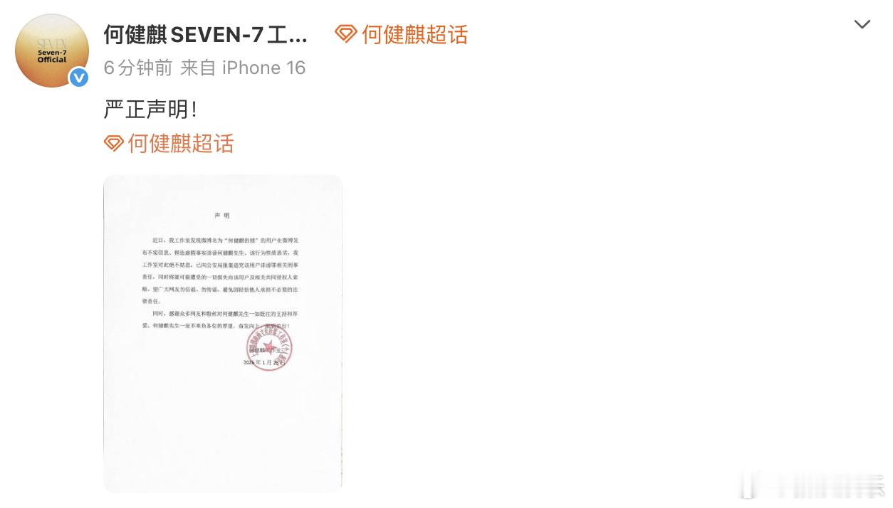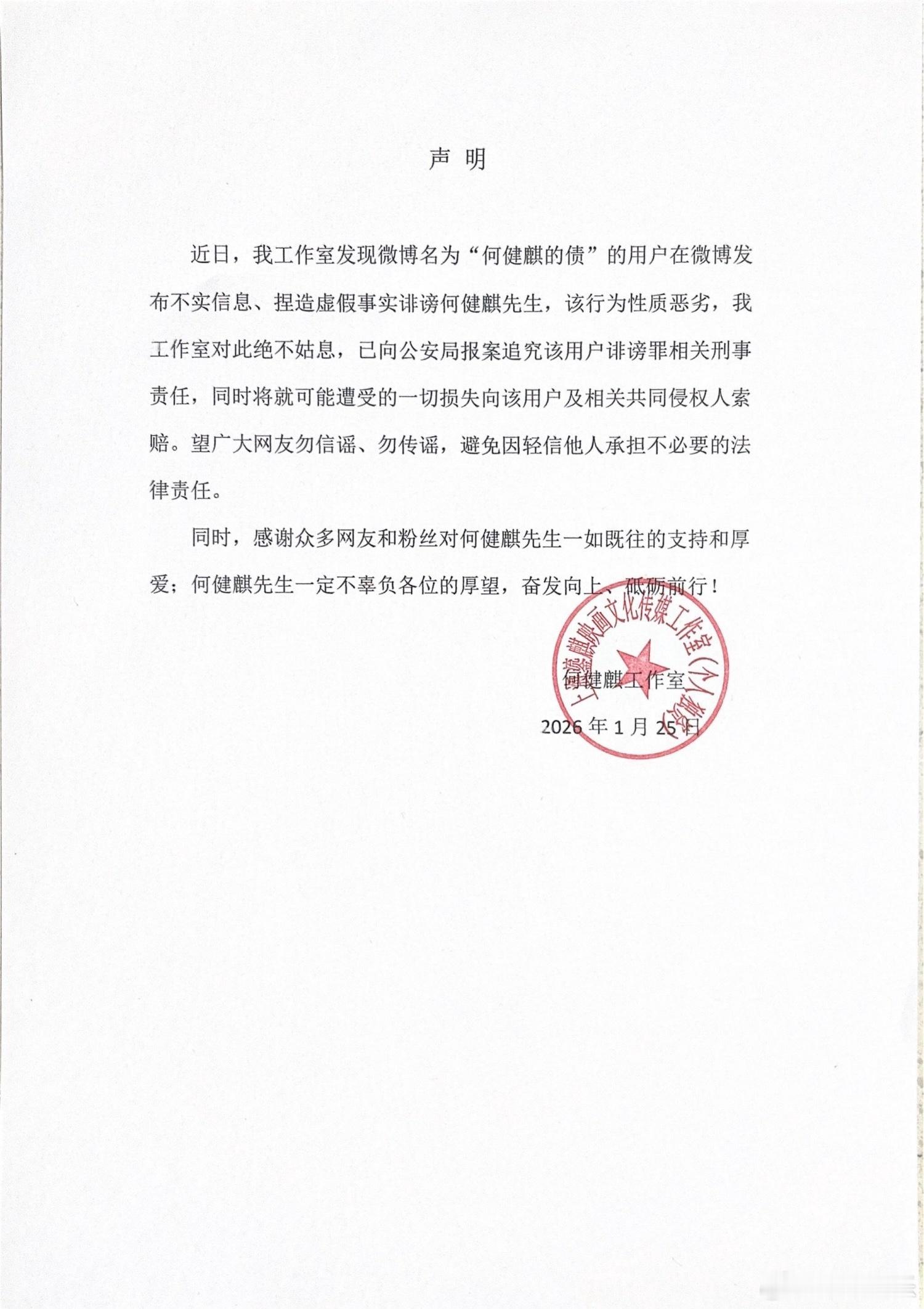 【何健麒方回应被举报涉毒 】何健麒方回应前女友实名举报涉毒 25日晚,有自称何健麒前女友的网友“何健麒的债”实名举报何健麒涉毒。刚刚,何健麒工作室发声明回应,称该用户发布不实信息、捏造虚假事实诽谤,已向公安局报案追究该用户诽谤罪相关刑事责任。 前女友实名举报何健麒涉毒