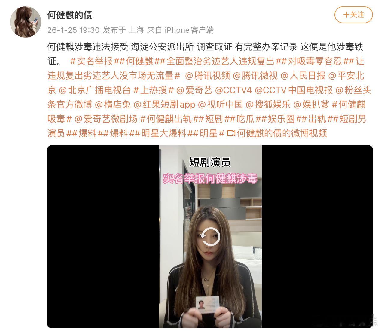 【何健麒方回应被举报涉毒】何健麒方回应前女友实名举报涉毒25日晚,有自称何健