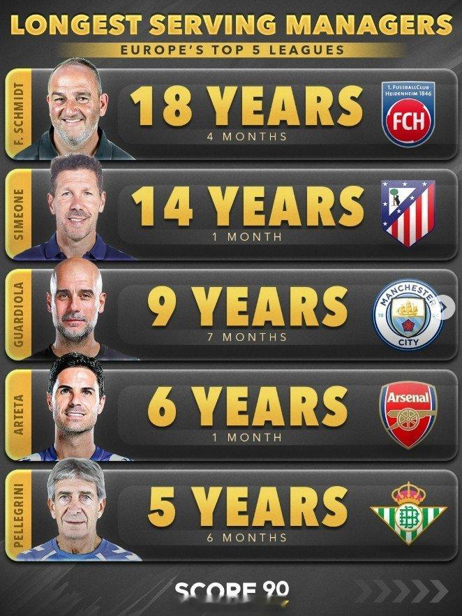 Score90盘点五大联赛球队现任主帅最长执教时长榜单,塔帅位列第四:1、施密特(海登海姆)18年4月2、西蒙尼(马竞)14年1月3、瓜迪奥拉(曼城)9年7月4、阿尔特塔(阿森纳)6年1月5、佩莱格里尼(贝蒂斯)5年6月 阿森纳著名教授 英超联赛