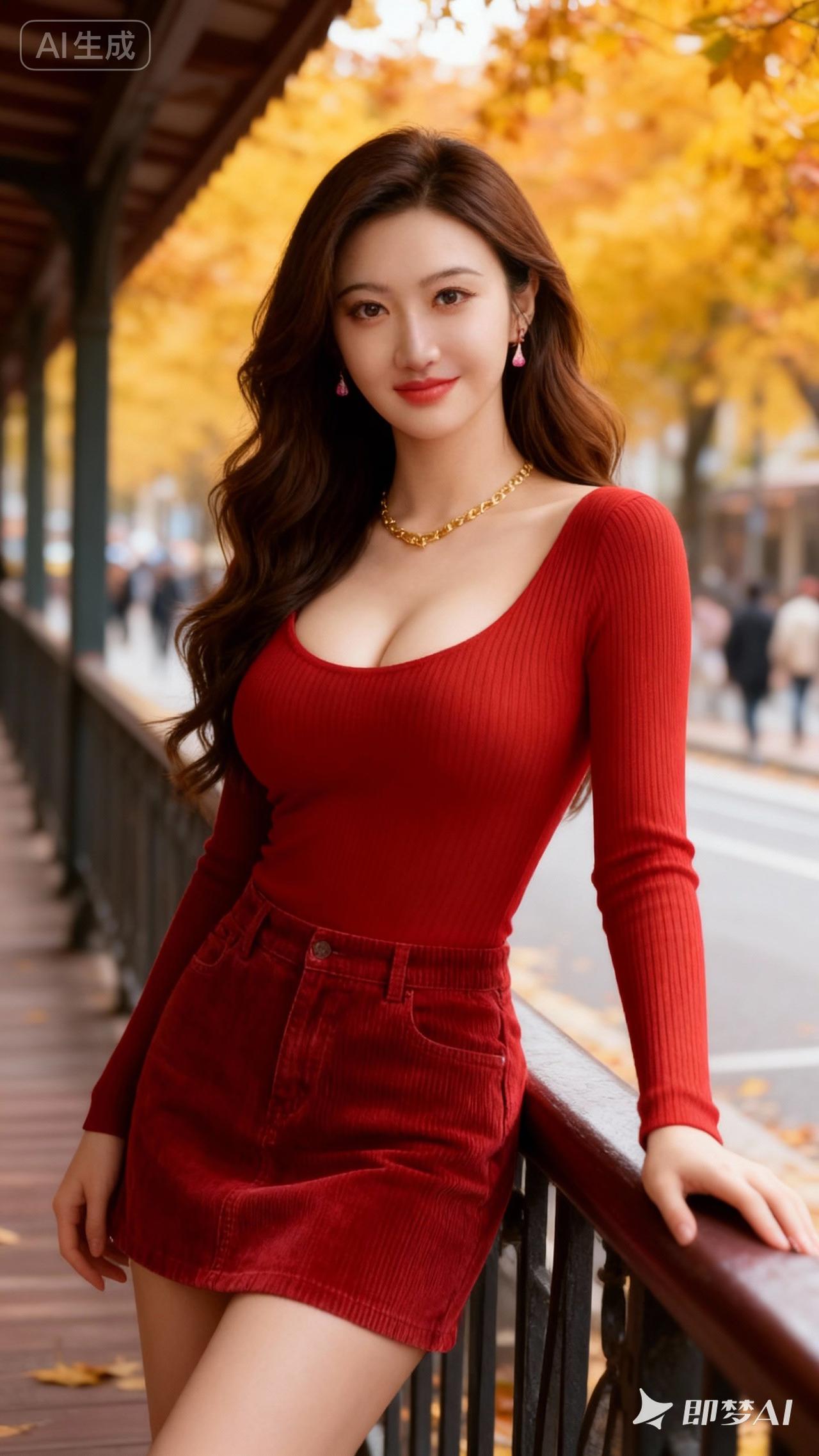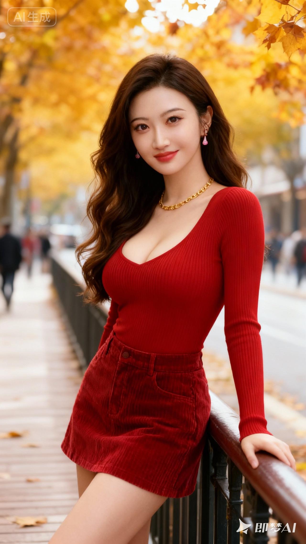秋日暖阳下,红裙少女漫步在落叶铺满的小径上,尽显温柔与优雅。