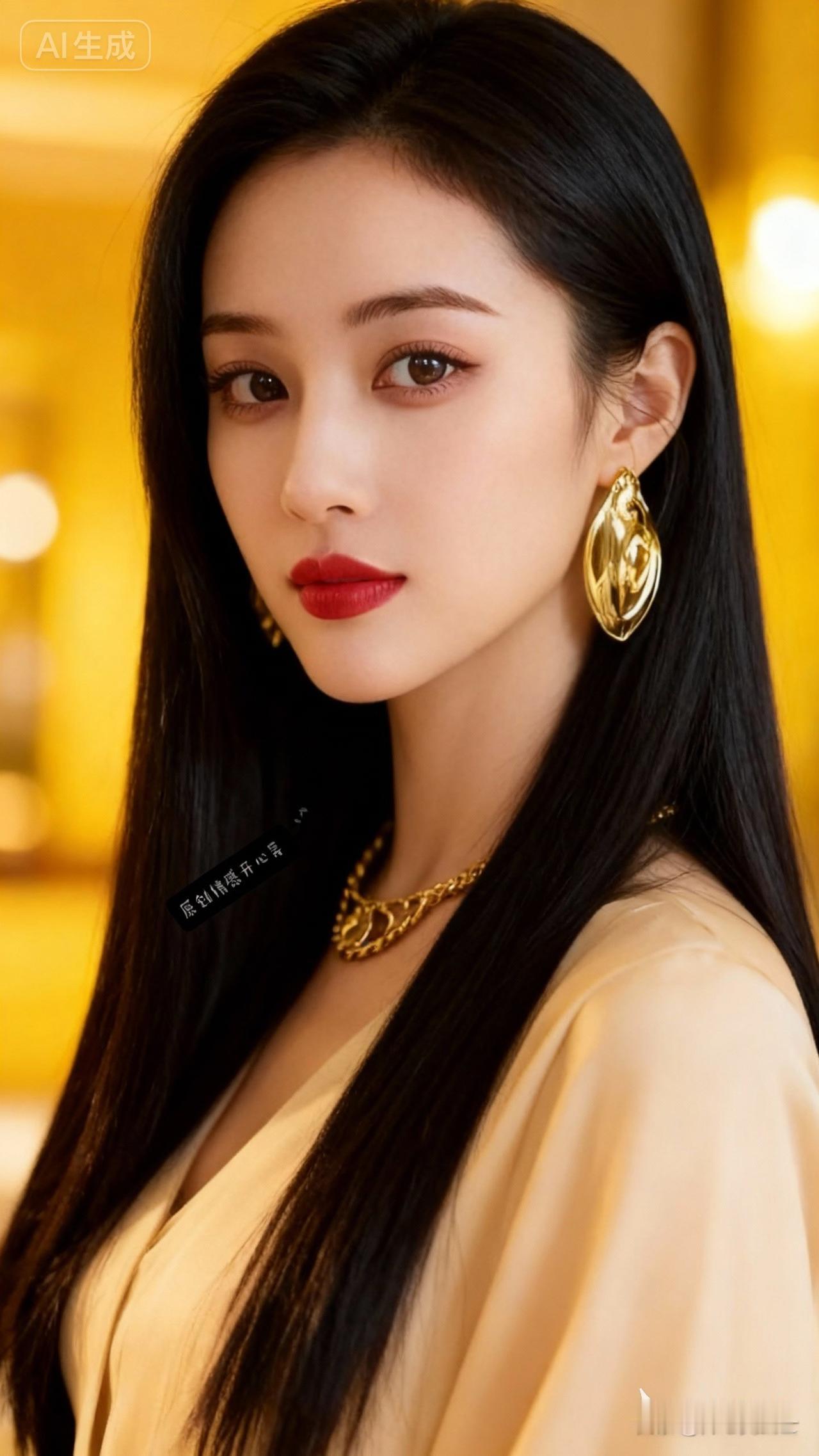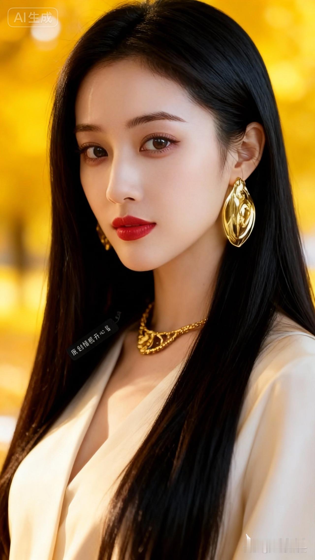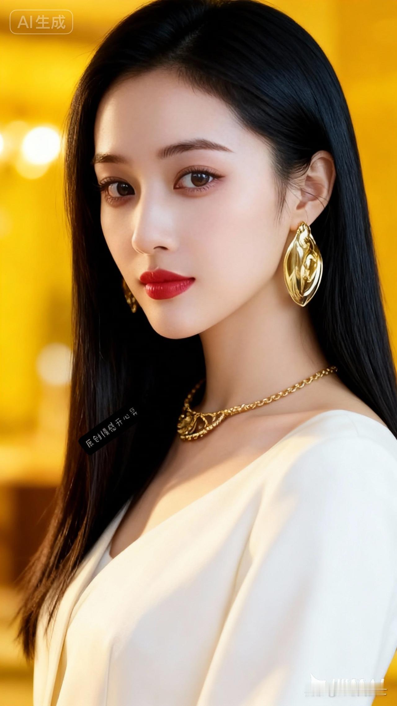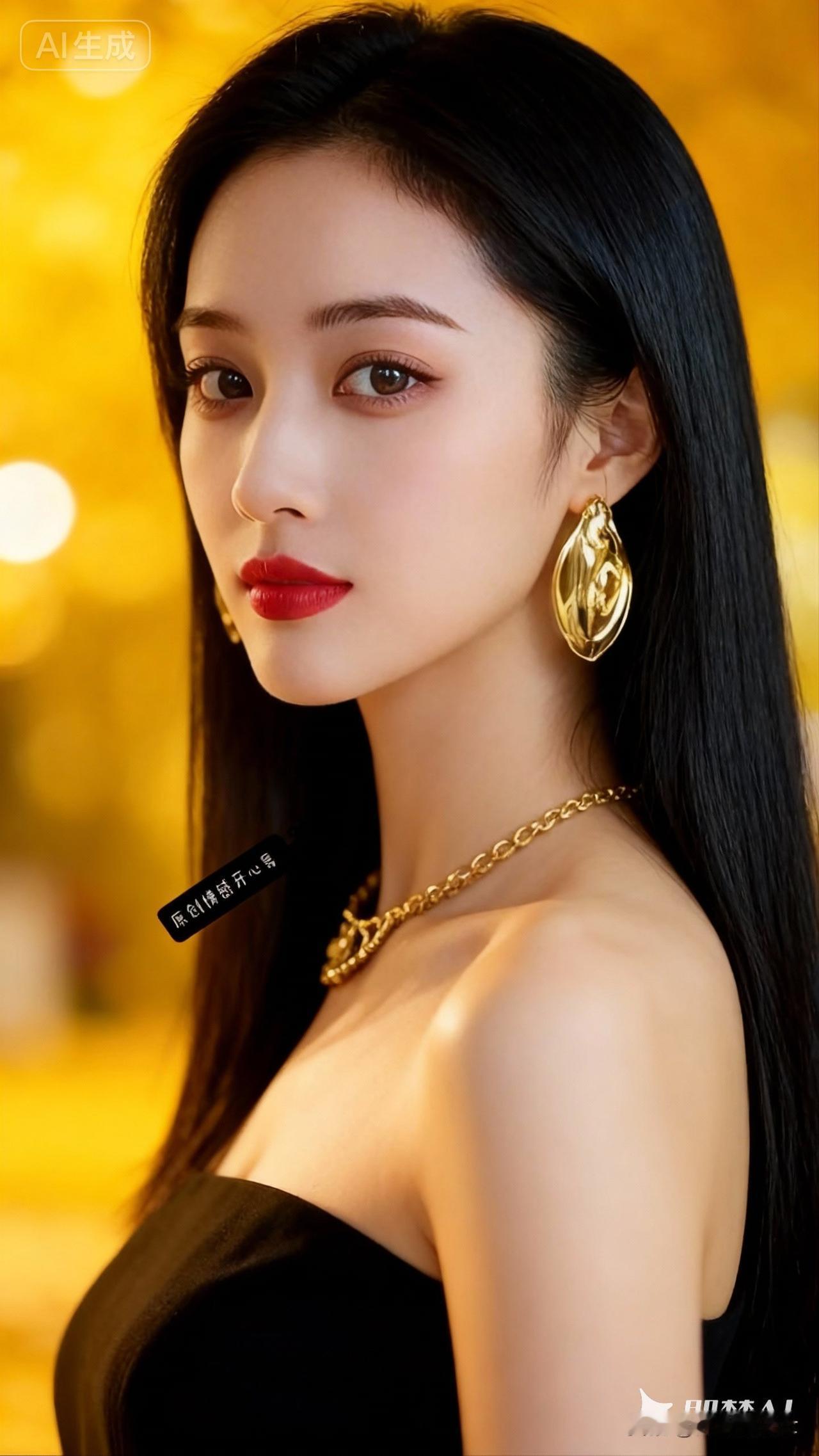 优雅黑发红唇,金色耳环闪耀,气质满分!