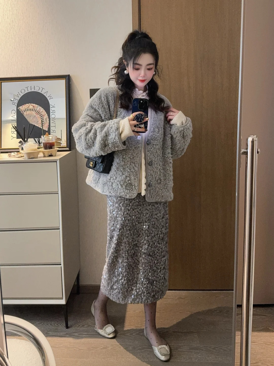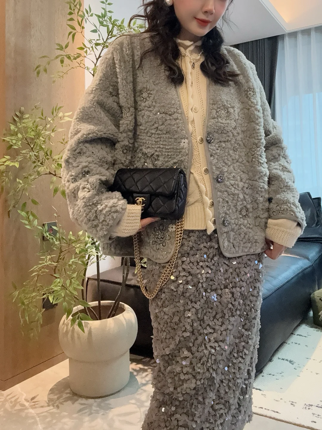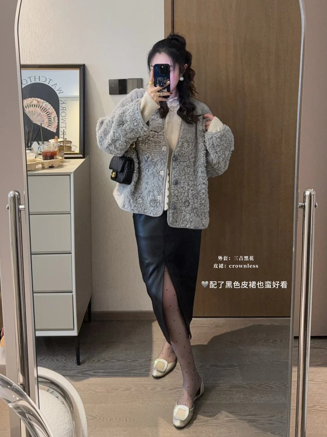 升了点温的周末,已经忍不住穿漂亮裙子去约会了~ 入了一件blingbling的厚外套,all grey真的很温柔很高级!带着我家加班狂魔去约饭了~ 姐妹们周末快乐鸭🎈