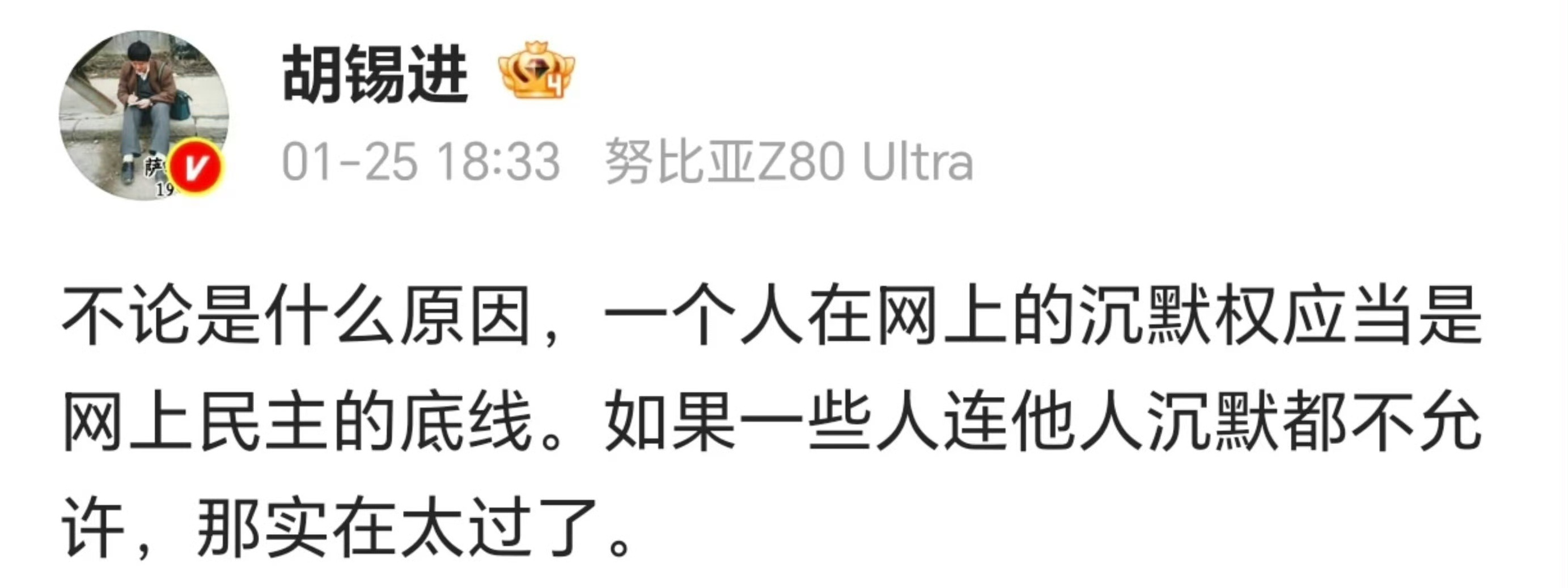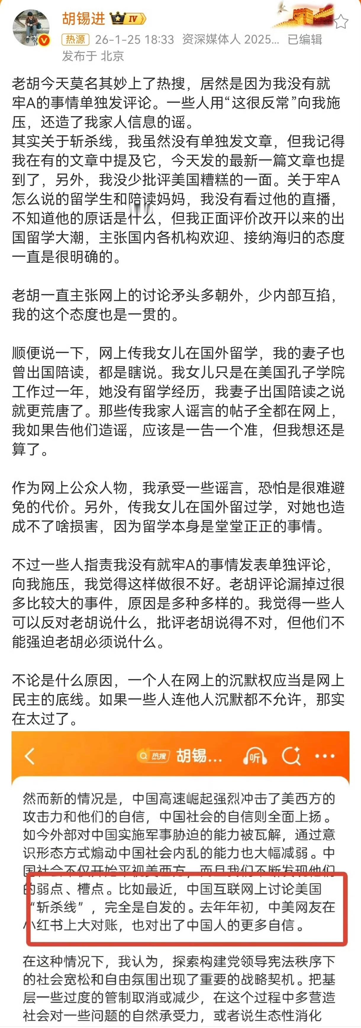 看了胡锡进就牢A斩杀线发评论,还是左右手互搏,能打败胡锡进的只有自己。长期以来,胡锡进式的表述,是属于不发表个人观点的长篇大论,针对很多事发表过评论的他,却漏掉了牢A斩杀线,哪怕广大网友邀请他来谈谈看法,他都不愿意,拿沉默权当挡箭牌,顾左右而言他,老胡有些应激了。胡锡进就牢A斩杀线发评论时事满谈2025年4月,董明珠在格力电器股东大会上发表“绝不用海归派,因为海归派里有间谍”的言论,胡锡进对此连续发文批评,要求董明珠道歉。如今,面对牢A提出的“斩杀线”概念,胡锡进罕见一言不发,甚至主张“沉默权”,再次暴露其双标。胡锡进就牢a斩杀线发评论