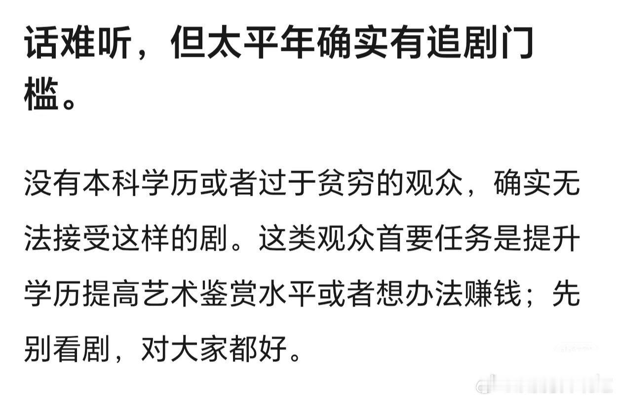 我觉得说这话的恐怕不是粉丝,而是太平年剧黑粉,毕竟这话太招黑了。你要是个啥学术专题讨论会视频,你说有门槛我信,你说一部剧有学历门槛,我呸。