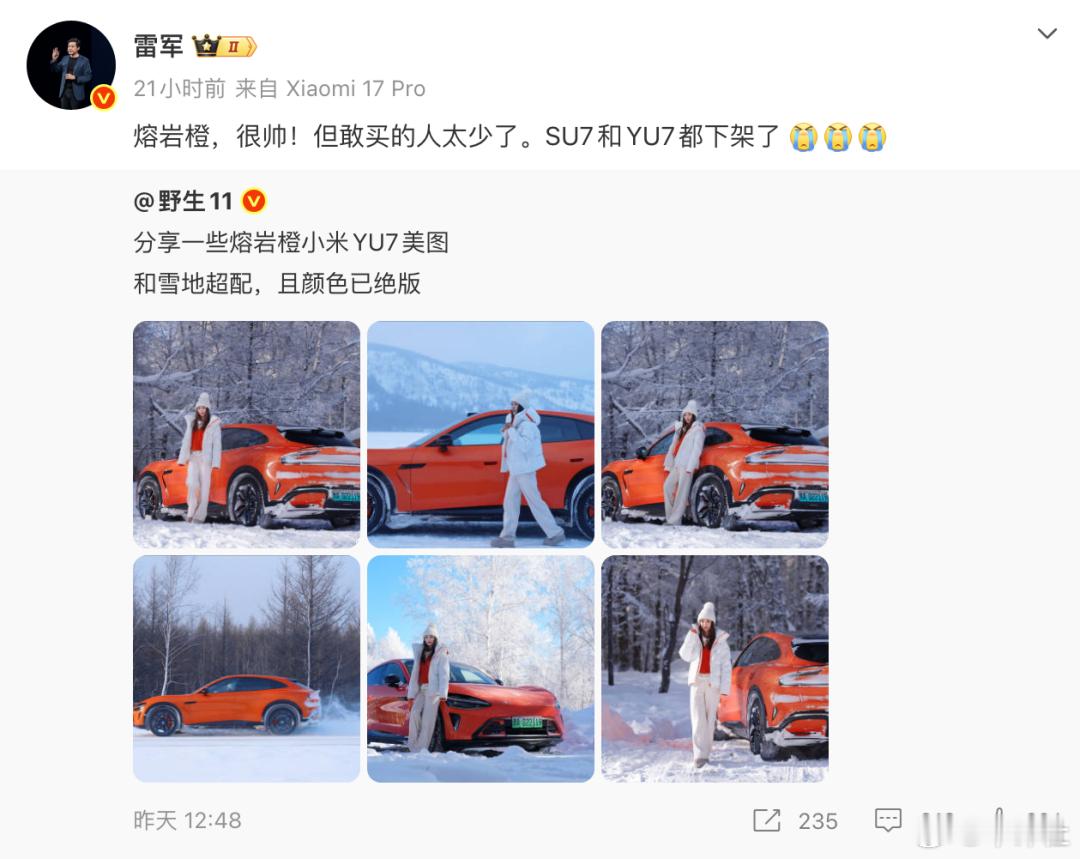 【“敢买的人太少了”!雷军无奈宣布下架】1月24日晚,雷军发文称“熔岩橙,很帅!但是敢买的人太少了。”雷军表示,目前小米SU7和YU7都下架了熔岩橙配色,并配上了三个“流泪”的表情,言语间透露出对这款精心设计车漆的不舍与无奈。大v聊车车评观察