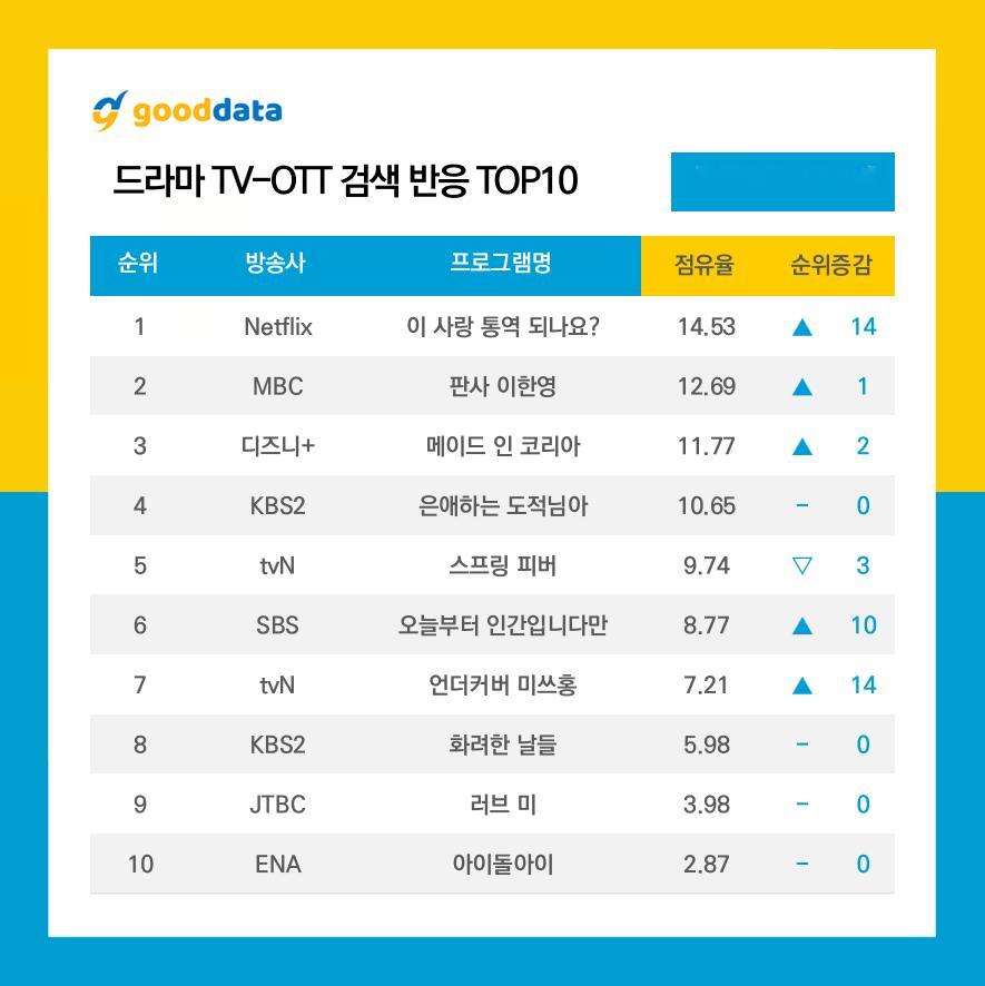 GOODDATA公布2026年1月第3周TV-OTT搜索榜TOP10、TV-OTT出演者搜索关键词TOP10、TV-OTT搜索关键词TOP10电视剧搜索榜TOP101.韩剧爱情怎么翻译 2.法官李汉英 3.韩国制造 4.韩剧恩爱的盗贼大人 5.春日狂热 6.今天开始是人类 7.韩剧卧底洪小姐 8.华丽的日子 9.韩剧Love Me 10.偶像疯子 电视剧出演者搜索关键词TOP101.《今天开始是人类》朴所罗门 2.《法官李汉英》朴熙顺 3.《恩爱的盗贼大人》文相敏 4.《今天开始是人类》金惠奫 5.《法官李汉英》白珍熙 6.《恩爱的盗贼大人》洪民基 7.《法官李汉英》元真儿 8.《春日狂热》安普贤 9.《法官李汉英》太元硕 10.《恩爱的盗贼大人》南志铉 电视剧搜索关键词TOP101.《卧底洪小姐》登场人物2.《春日狂热》登场人物3.《恩爱的盗贼大人》登场人物4.《韩国制造》几集5.《Love Me》登场人物6.《法官李汉英》重播7.《春日狂热》意思8.《爱情怎么翻译》出演阵容9.《华丽的日子》登场人物10.《韩国制造》6集